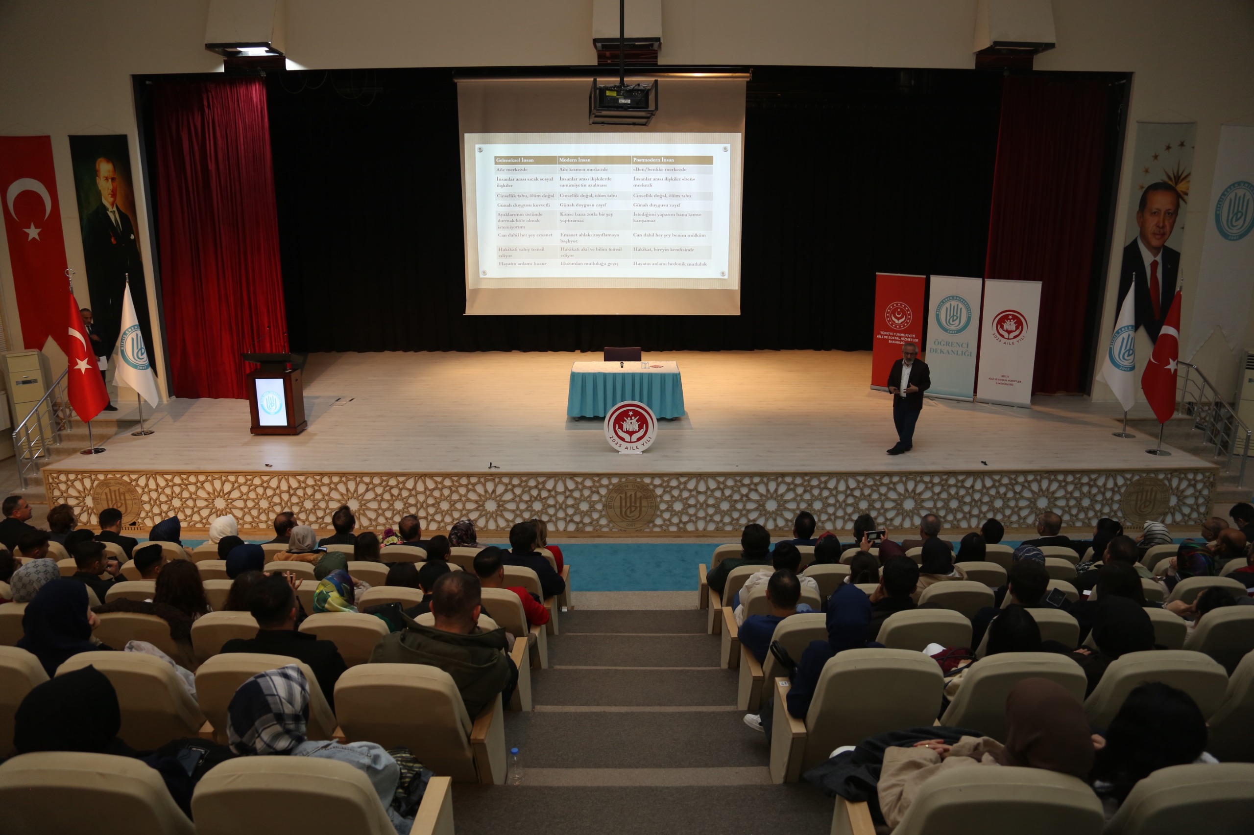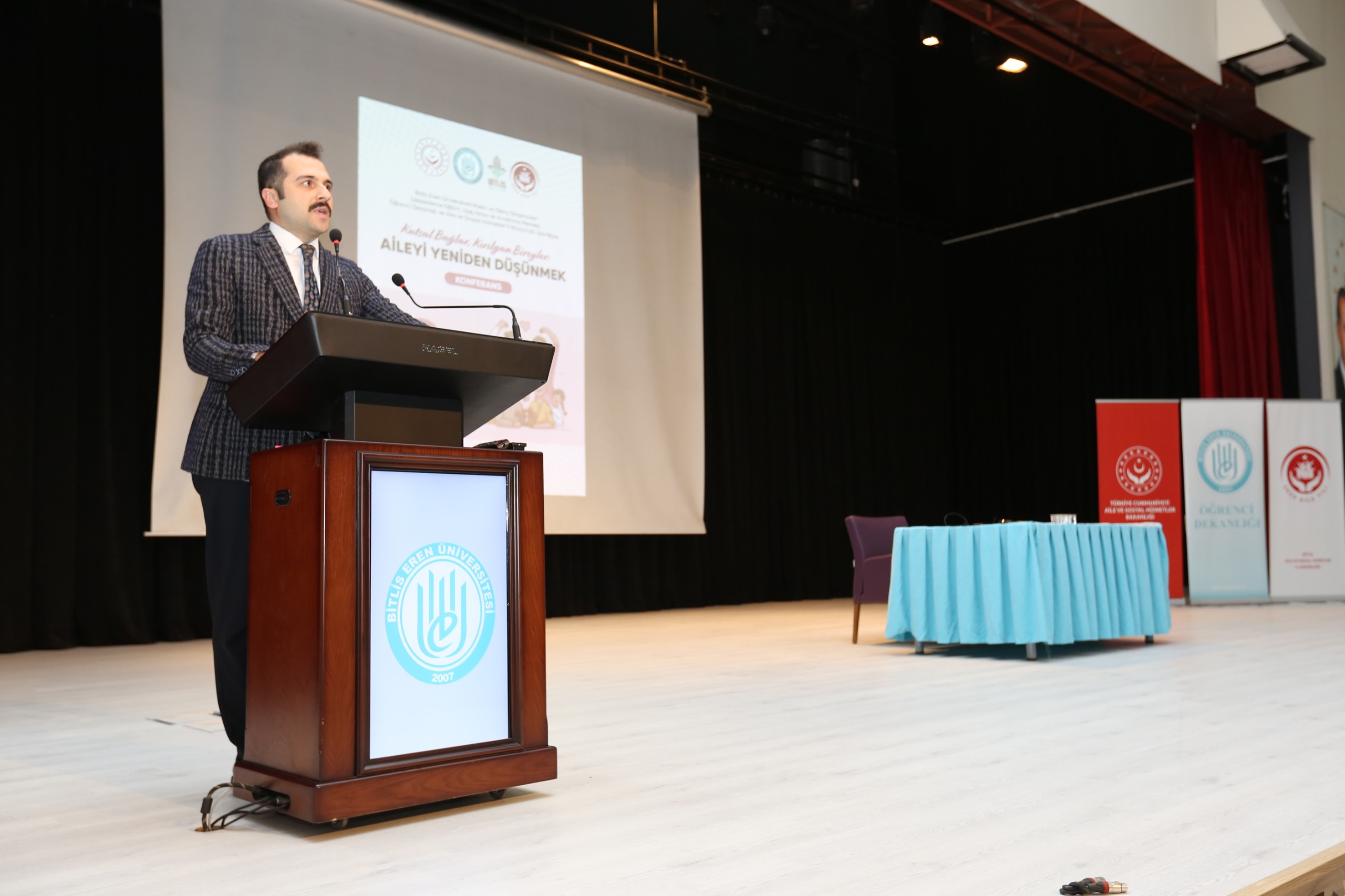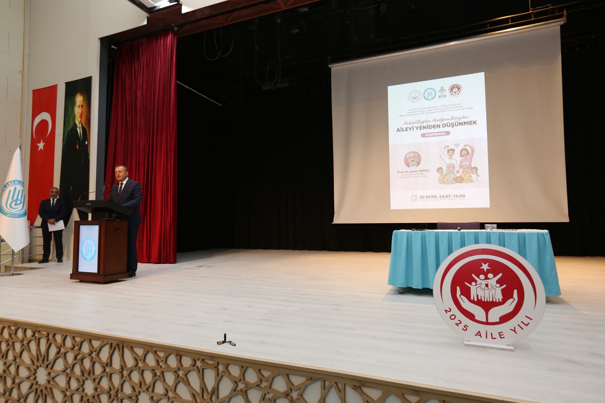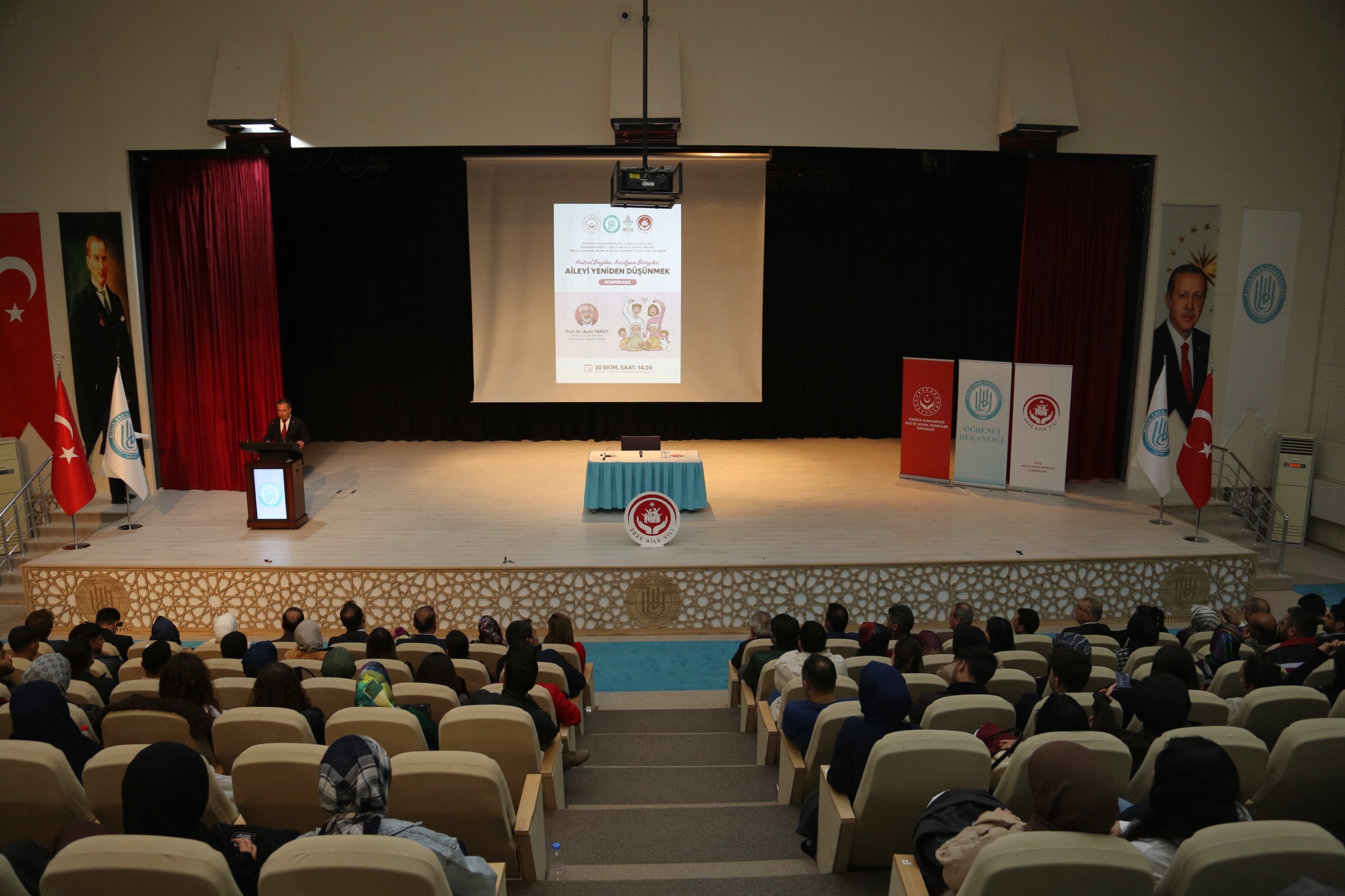 Aile Yılı kapsamında Bitlis’te anlamlı bir konferans düzenlendi. Sayın Prof. Dr. Asım Yapıcı’nın konuşmacı olduğu “Kutsal Bağlar, Kırılgan Bireyler: Aileyi Yeniden Düşünmek” başlıklı konferans, Bitlis Aile ve Sosyal Hizmetler İl Müdürlüğümüz ile Bitlis Eren Üniversitesi iş birliğiyle gerçekleşti. İl Müdürümüz Vefa Akdoğan’ın açılış konuşmasını yaptığı programa; Vali Yardımcısı Sayın Onur Aykaç, Bitlis Eren Üniversitesi Rektörü Sayın Prof. Dr. Necmettin Elmastaş, Tatvan Adalet Komisyonu Başkanı Sayın İbrahim Mısırcı, akademisyenler, kurum amirleri, öğrenciler ve aileler yoğun ilgiyle katıldı. Konferansta ailenin birey üzerindeki koruyucu rolü, toplumsal yapıdaki yeri ve kırılgan bireylerin güçlendirilmesinde aile bağlarının önemi vurgulandı. Güçlü toplumlar, sağlam aile temelleriyle yükselir. Aileyi yeniden düşünmek, geleceği yeniden inşa etmektir.