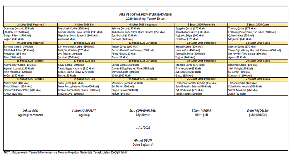 Şubat Ayı Yemek Listesi