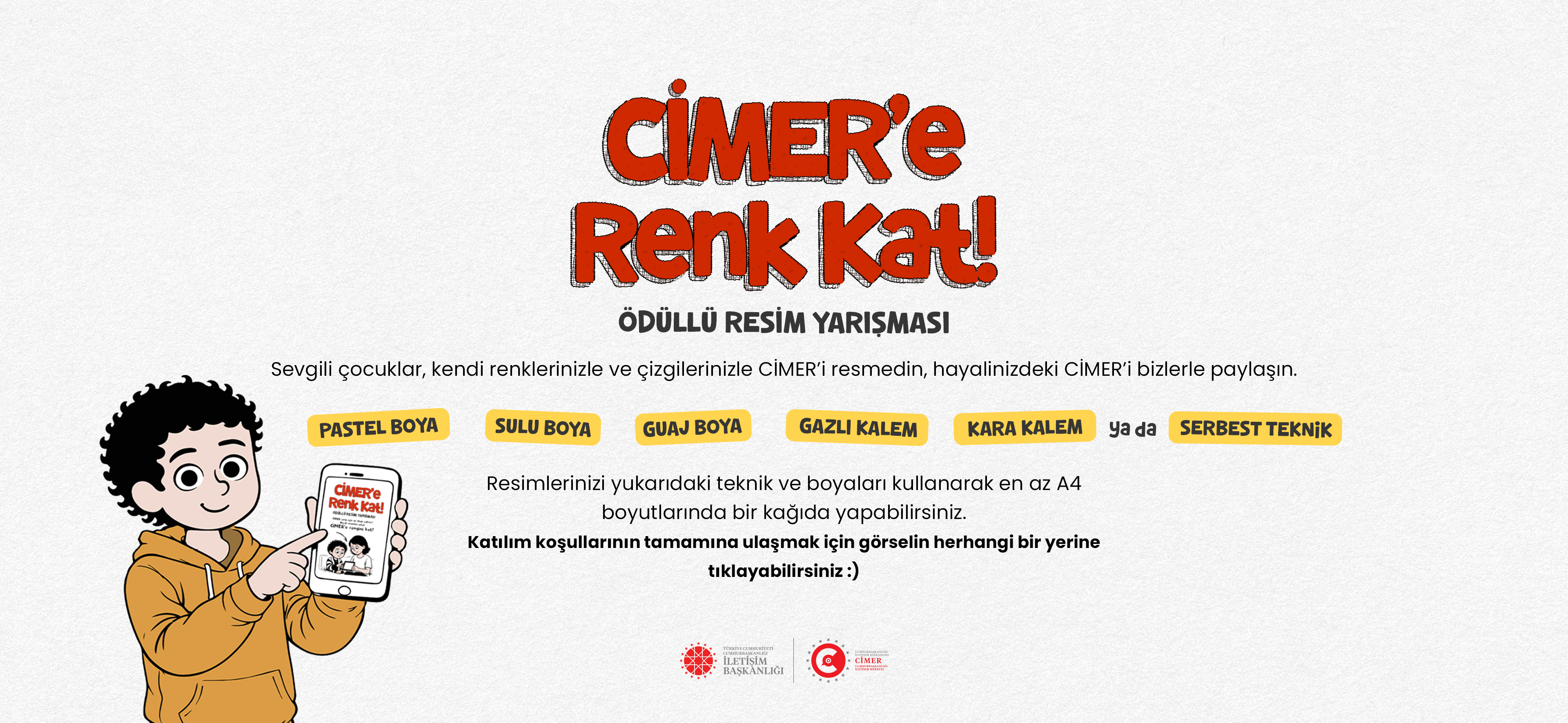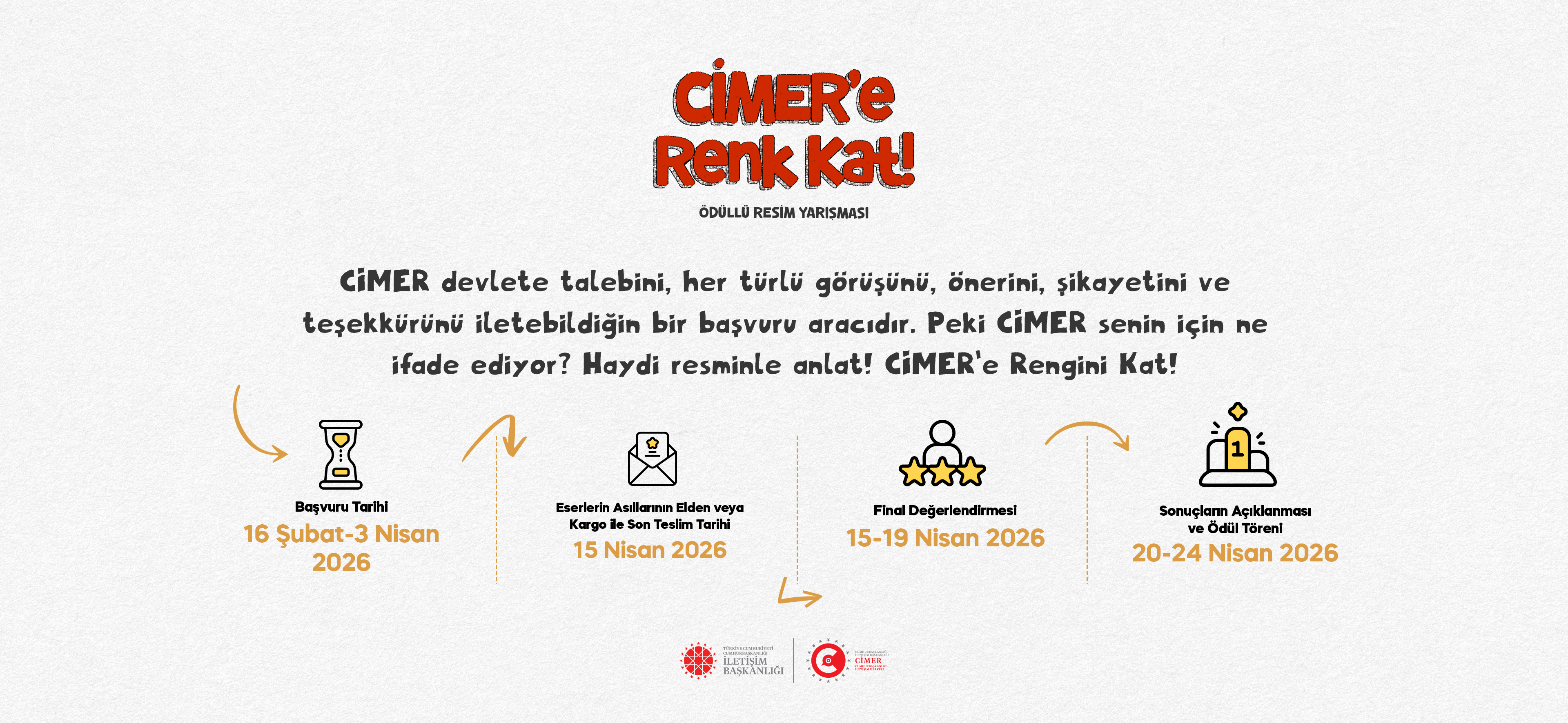 Cumhurbaşkanlığı İletişim Başkanlığımız tarafından düzenlenecek olan “CİMER’e Renk Kat” ödüllü resim yarışması ile çocuklar hayallerindeki CİMER’i resmedecek, CİMER’e renk katacak.