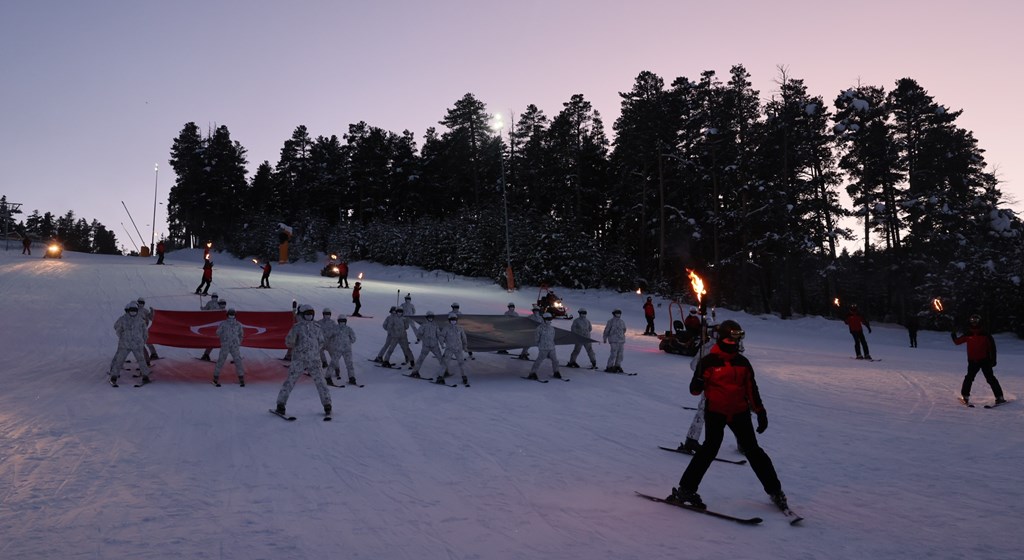 Sarıkamış Kayak Merkezi'nde düzenlenen etkinlikte, Çanakkale'deki 57. Alaya ithafen Sarıkamış'ta konuşlanan 57. Komando Taburu'nda görevli komandolar ve JAK timleri, ellerinde Türk bayrakları ve Atatürk posterleri taşıyarak meşalelerle zirveden indi.