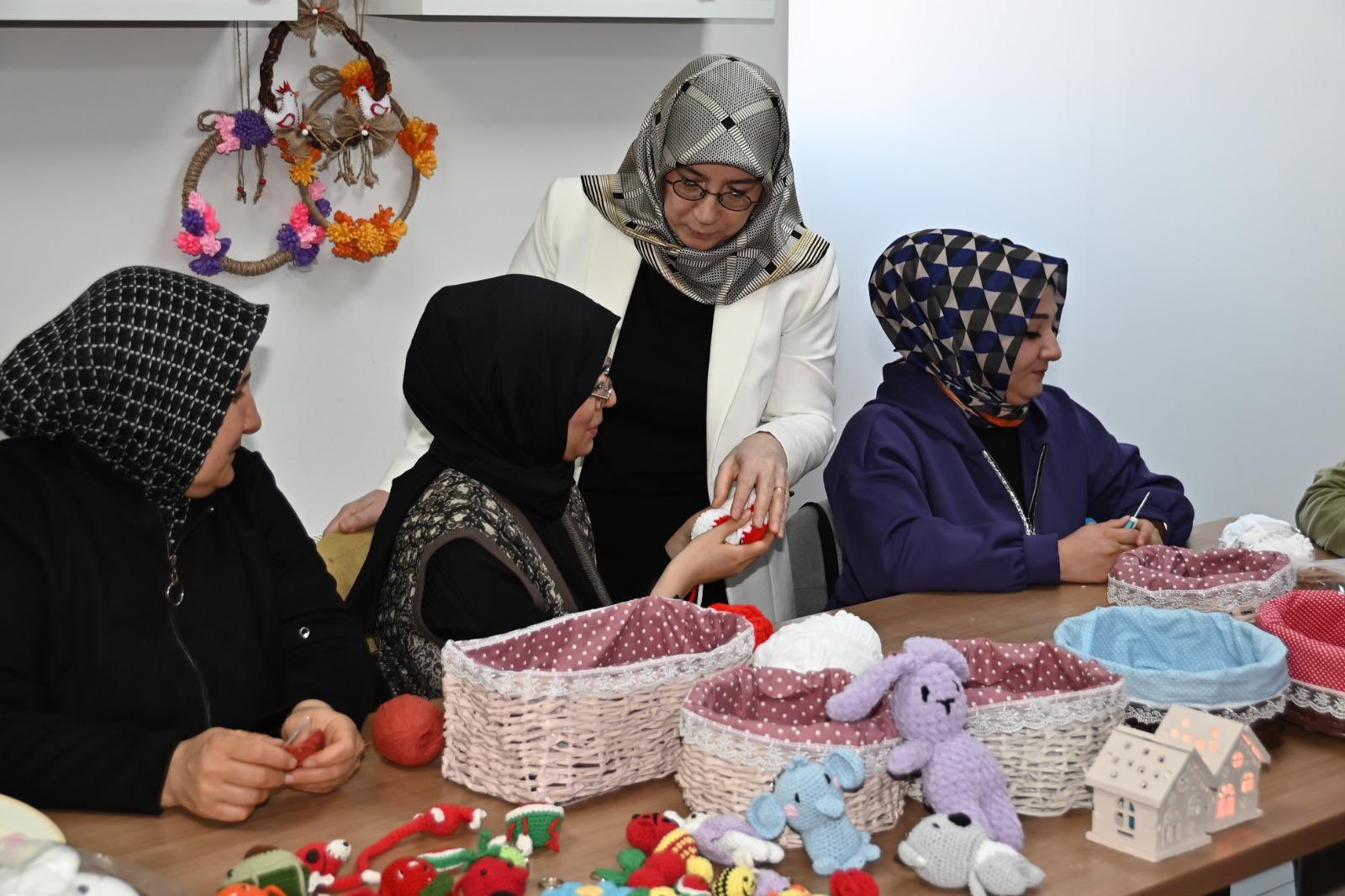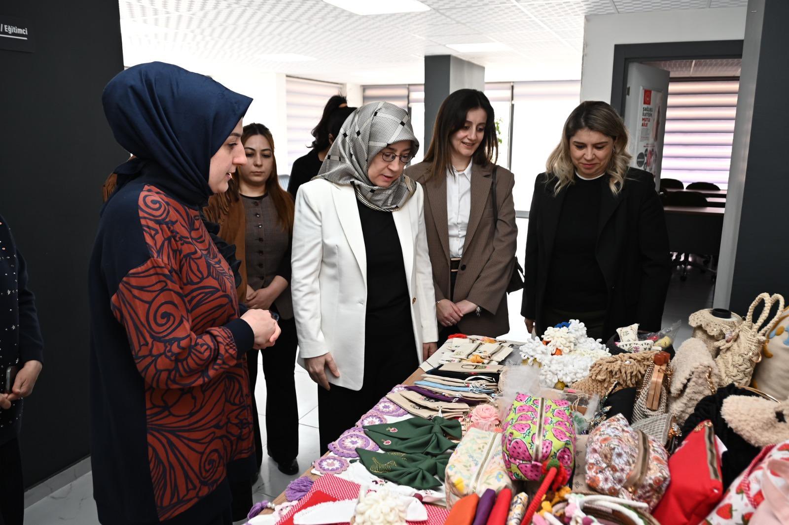 Ziyaret kapsamında kursiyerlerle yakından ilgilenen Prof. Dr. Fatma Fidan, el emeğiyle hazırlanan ürünleri inceleyerek yürütülen çalışmalar hakkında yetkililerden bilgi aldı.