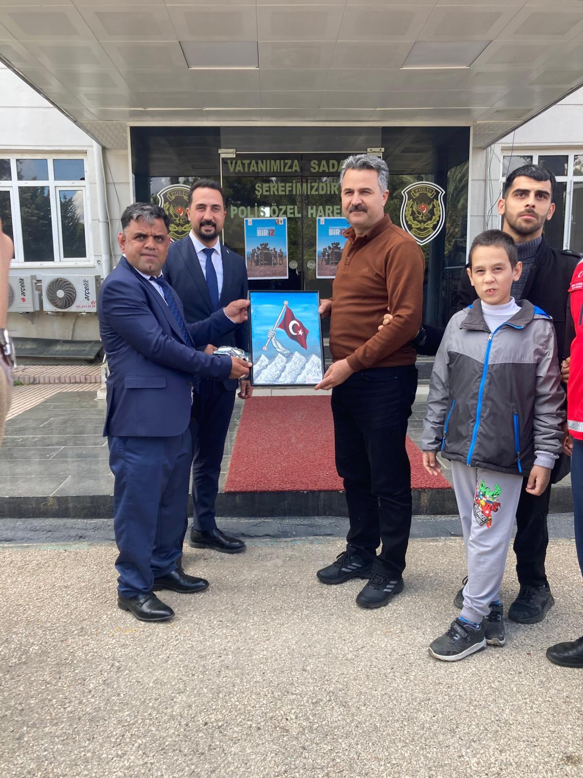 İl Müdürümüz Sayın Tolga Nacar ve İl Müdür Yardımcımız Fatih Gün’ün katılımıyla, Osmaniye Bakım, Rehabilitasyon ve Aile Danışma Merkezi’nden hizmet alan kıymetli bireylerimiz Polis Haftası kapsamında İl Emniyet Müdürlüğü Özel Harekât Şube Müdürlüğü’nü ziyaret etti. Ziyaret kapsamında bireylerimiz tarafından hazırlanan özel tablolar, Osmaniye Özel Harekat Şube Müdürü Sayın Aydın Aydoğan ‘a takdim edildi.Bu anlamlı buluşmada, sevgileriyle bütün dünyaya umut veren özel bireylerimiz Milletimizin huzur ve güvenliği için gece gündüz demeden fedakârca görev yapan kahraman polislerimize şükranlarını sıcacık tebessümleriyle sunarak,Polis Haftası’nı en içten dilekleri ile kutladılar.