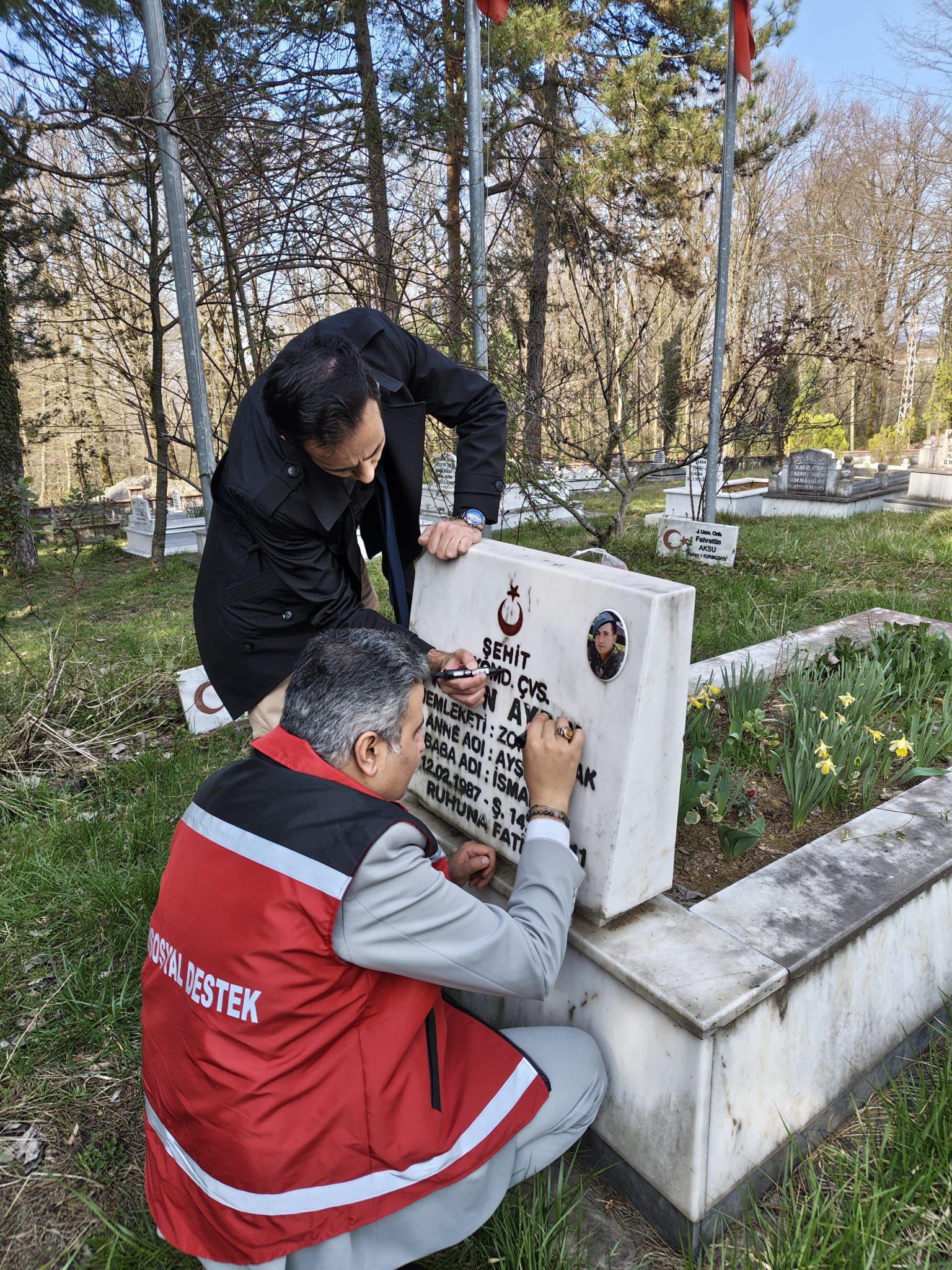 Gerçekleştirilen ziyaret kapsamında, şehitlerimiz dualarla yâd edilmiş; kabirleri başında saygı ve minnet duygularımız ifade edilmiştir. Ayrıca, silinmiş olan kabir yazıları yenilenmiş ve sancak değişimleri gerçekleştirilmiştir.