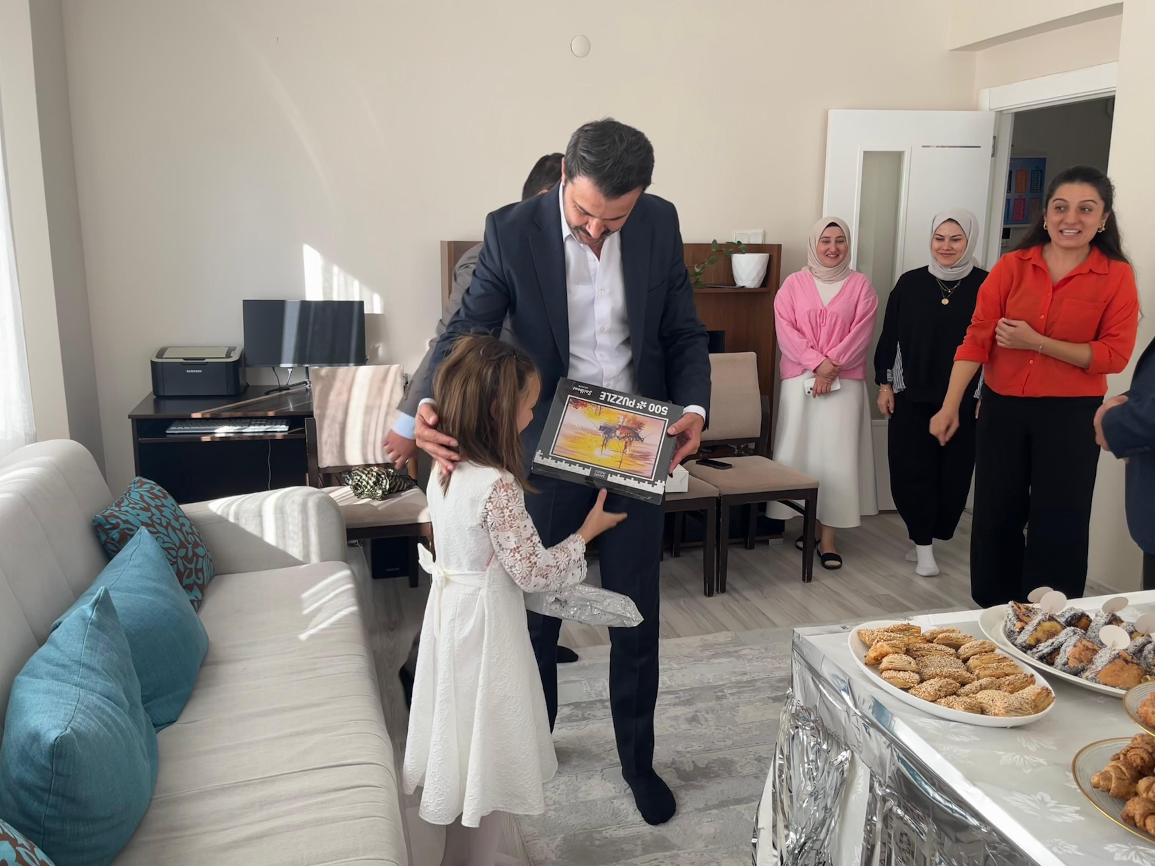 Güneşin üzerinde uyukladığı evlerin çatıları altında, pencereden sokağa bakan yavrularımızın; kaldırımda yürürken ellerinde ekmeklerle evlerine dönen babalar gibi elinde hediyelerle kapılarını çalan İl Müdürümüz Bilal Erdoğan’ı karşılamaları ve yavrumuzun doğum günü sevinci görülmeye değerdi…