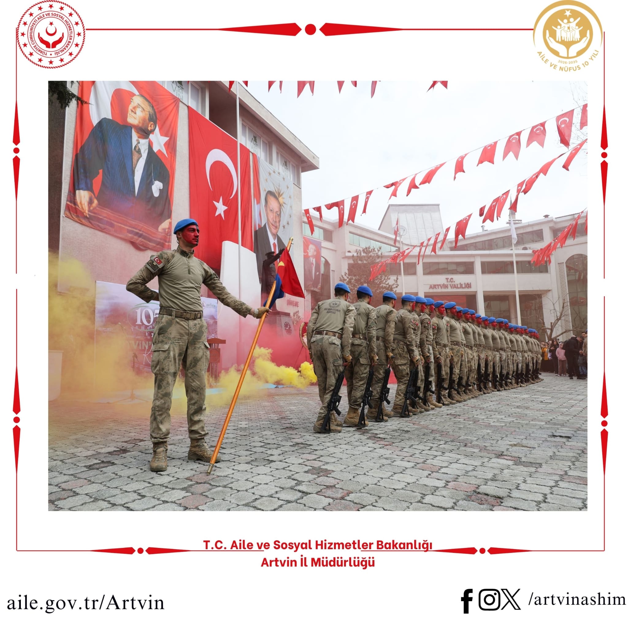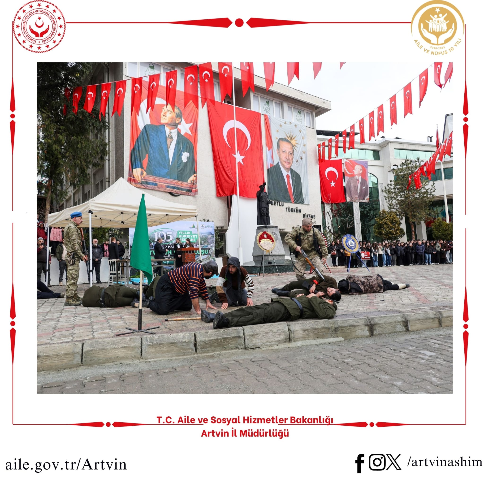 Valimiz Sayın Dr. Turan Ergün ve eşi Hülya Ergün Hanımefendi, il protokolü ve vatandaşlarımızın katılımıyla Milli İrade Meydanı'nda Artvin'in Düşman İşgalinden Kurtuluşunun 105. Yıl Dönümü Kutlama programı düzenlendi. Kutlama programına İl Müdürümüz Sayın Nevim Öz ve kurum personellerimiz de katılım sağladı.