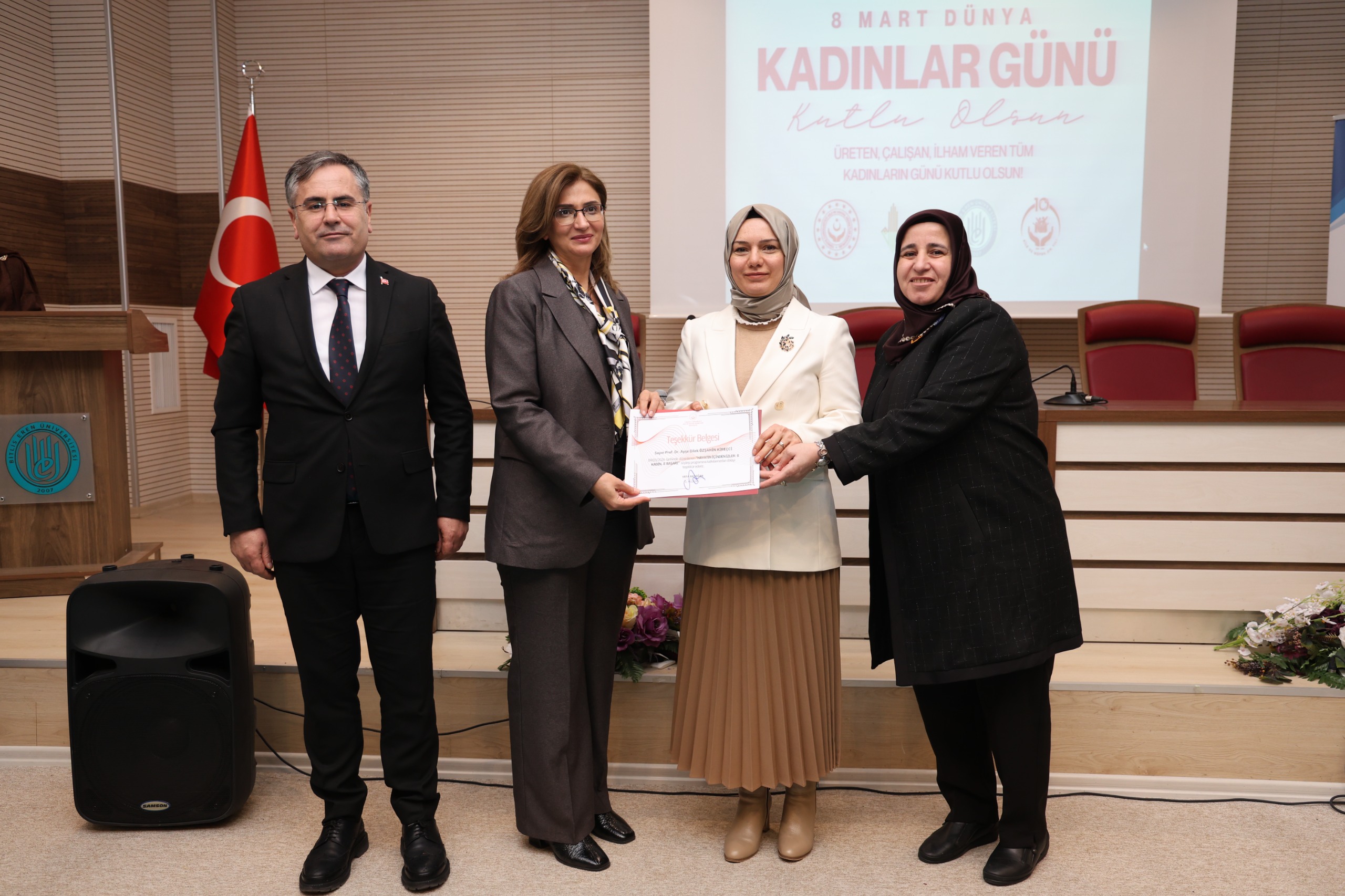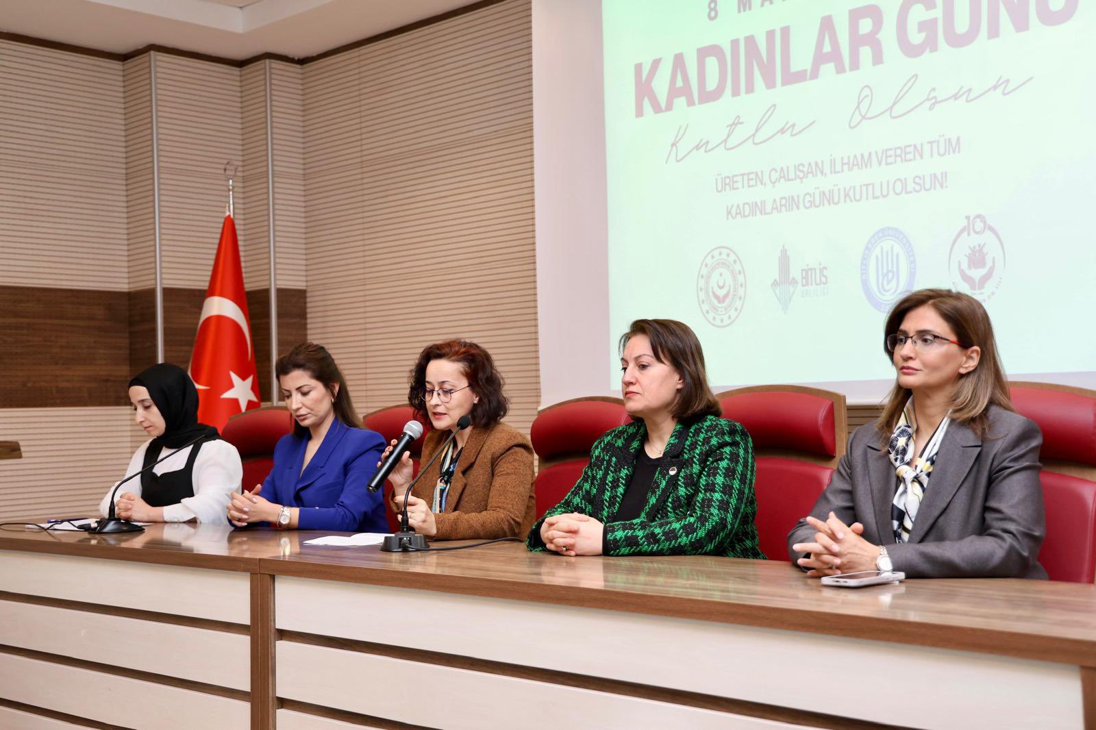 Valimiz Sayın Ahmet Karakaya, eşi Özlem Karakaya Hanımefendi ile birlikte 8 Mart Dünya Kadınlar Günü dolayısıyla düzenlenen “Hayatın İçinden İzler: 8 Kadın 8 Başarı” söyleşi programına katıldı. Valiliğimiz himayelerinde, Bitlis Eren Üniversitesi ile Aile ve Sosyal Hizmetler İl Müdürlüğümüz koordinesinde gerçekleştirilen programda; hayatın farklı alanlarında başarı hikâyeleriyle öne çıkan kadınlar tecrübelerini katılımcılarla paylaştı. Kadınların azmi, emeği ve kararlılığıyla elde ettikleri başarıların anlatıldığı söyleşide, toplumsal hayatta kadının rolü ve katkıları vurgulandı. Sayın Valimiz konuşmalarında; kadınların toplumun her alanında önemli görevler üstlendiğini belirterek eğitimden ekonomiye, sanattan spora kadar birçok alanda elde edilen başarıların gurur verici olduğunu ifade etti. Kadınların güçlenmesinin toplumun güçlenmesi anlamına geldiğini vurgulayan Valimiz, tüm kadınların 8 Mart Dünya Kadınlar Günü’nü kutladı. Program kapsamında kurulan stantları da ziyaret eden Sayın Valimiz ve Özlem Karakaya Hanımefendi, yürütülen çalışmalar hakkında yetkililerden bilgi aldı. Program sonunda Sayın Valimiz, Özlem Karakaya Hanımefendi ve Aile ve Sosyal Hizmetler İl Müdürümüz Vefa Akdoğan tarafından programa katılan kadınlara karanfil takdim edildi. Programa; Bitlis Eren Üniversitesi Rektörü Sayın Prof. Dr. Necmettin Elmastaş, Bitlis Baro Başkanı Sayın Av. Gülhan Bayram Sekmen, İl Jandarma Komutanı Sayın Tuğgeneral Barış Soyal, İl Emniyet Müdürü Sayın Koray Şensoy, Aile ve Sosyal Hizmetler İl Müdürümüz Vefa Akdoğan, kurum amirleri, akademisyenler ve çok sayıda vatandaşımız katıldı.