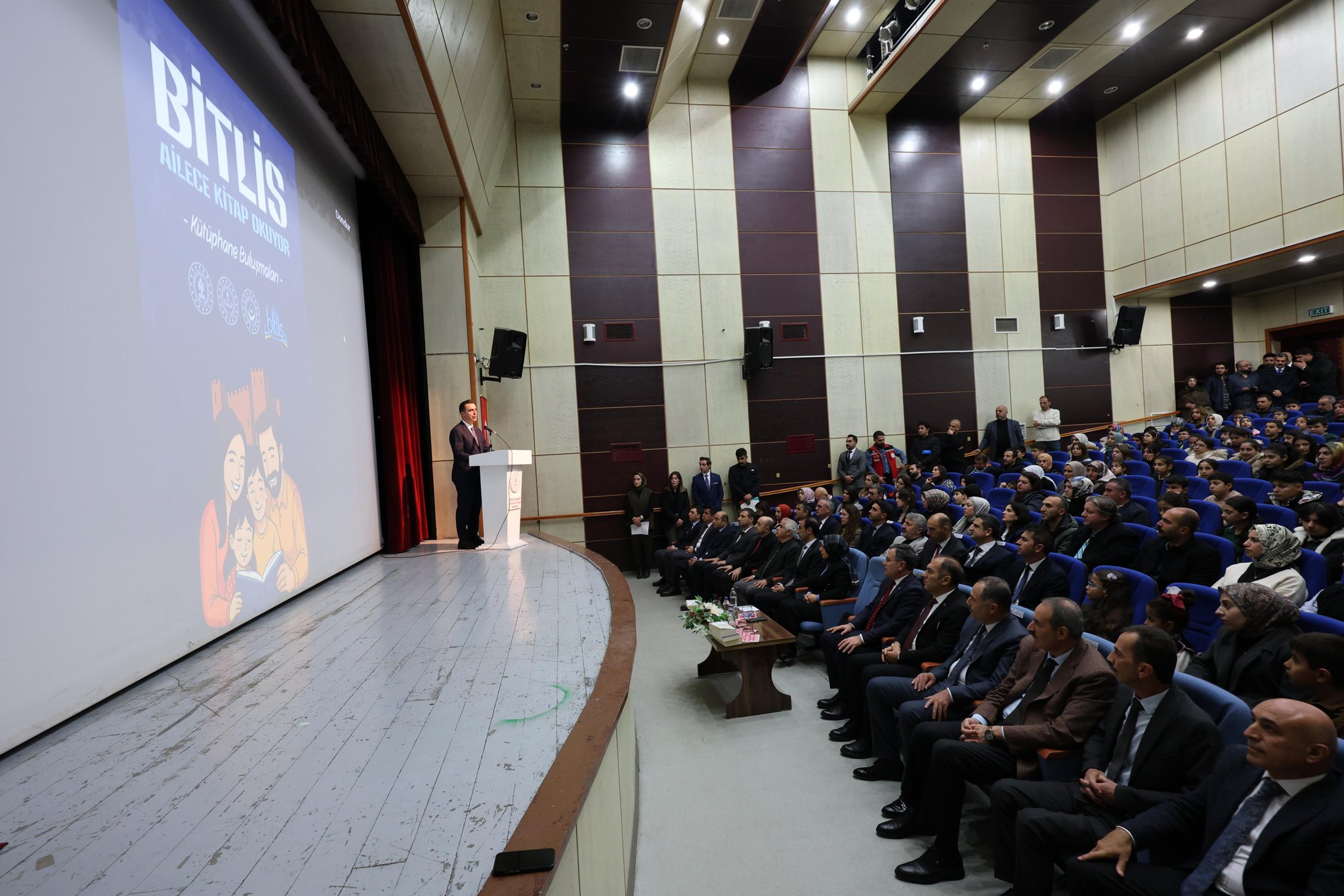 Valimiz Sayın ve eşi Özlem Karakaya Hanımefendi, Valiliğimiz koordinesinde; İl Kültür ve Turizm Müdürlüğü, İl Millî Eğitim Müdürlüğü ile Aile ve Sosyal Hizmetler İl Müdürlüğümüz iş birliğinde yürütülen “Bitlis Ailece Kitap Okuyor” Kütüphane Buluşmaları programına katıldı. Programda aile kurumunun önemine değinen Vali Karakaya, “Bir toplum ancak ailesi kadar güçlüdür.” diyerek çocuklarda ve ailelerde kitap okuma kültürünün güçlendirilmesi gerektiğini vurguladı. “Her gün en az yarım saatimizi kitaplara ayırmaya davet ediyorum.” ifadelerini kullandı. Kütüphane Buluşmaları kapsamında ailelerimizin kütüphanelerde sosyalleşmesi, kaliteli vakit geçirmesi ve çocuklarımızda okuma alışkanlığının geliştirilmesi hedeflenmektedir. Programın hazırlanması, sunum içeriklerinin oluşturulması ve organizasyonun yürütülmesinde İl Müdürlüğümüz personelinin özverili emeği büyük bir katkı sağlamıştır. Katılımcılara sunulan içerikler, Müdürlüğümüz personeli tarafından titizlikle hazırlanmış; sinevizyon gösterimi ve müzik dinletileri de eklenerek program zenginleştirilmiştir. Sayın Valimiz, etkinliğin sonunda öğrencilerimiz ve ailelerimizle birlikte bir süre kitap okuyarak programa destek vermiştir. Programa; İl Kültür ve Turizm Müdürü Sayın Osman Fadıl Üner, İl Millî Eğitim Müdürü Sayın Vedat Kaya, Aile ve Sosyal Hizmetler İl Müdürümüz Vefa Akdoğan, kurum müdürleri, öğretmenlerimiz, öğrencilerimiz, aileleri ve vatandaşlarımız katılım sağlamıştır.