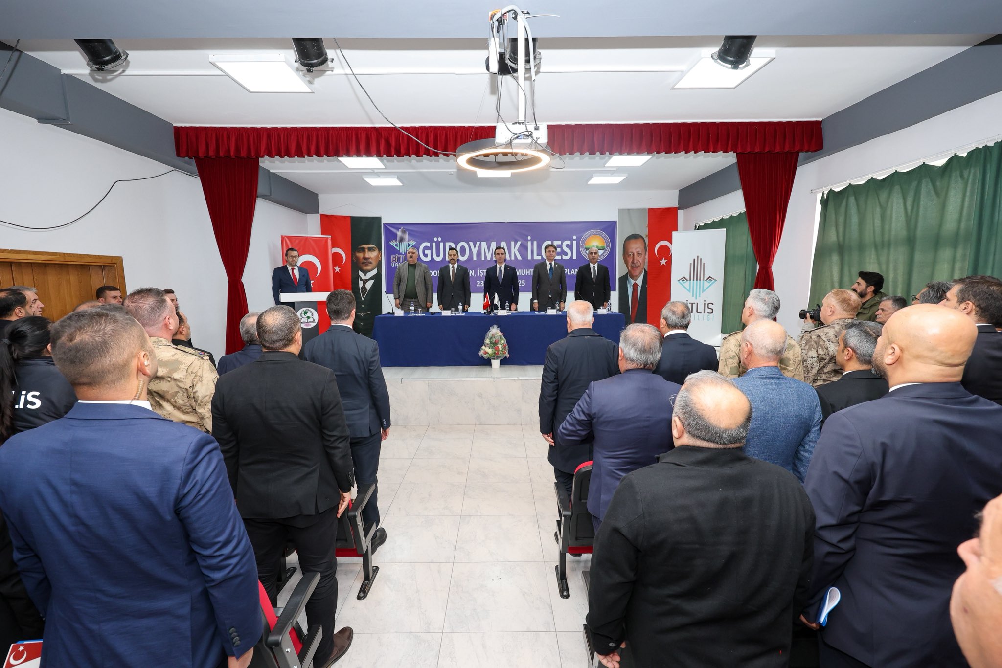 Valimiz Sayın Ahmet Karakaya başkanlığında “Güroymak İlçe Koordinasyon, İstişare ve Muhtarlar Toplantısı” gerçekleştirildi. Toplantıda; Güroymak ilçemizde yürütülen kamu hizmetleri ile birlikte birçok alanda hayata geçirilen ve planlanan projeler kapsamlı şekilde ele alındı. Muhtarlarımız; mahalle ve köylerinde karşılaştıkları sorunları, vatandaşlarımızdan gelen talepleri ve çözüm önerilerini doğrudan iletme imkânı buldu. Toplantıda değerlendirmelerde bulunan Sayın Valimiz; vatandaşlarımıza daha etkin, hızlı ve nitelikli hizmet sunabilmek adına bu tür istişare toplantılarının büyük önem taşıdığını vurgulayarak, toplantıda alınan kararların ilçemiz için hayırlı olmasını temenni etti. Toplantıya; Vali Yardımcısı Alay Yazıcı, Güroymak Kaymakamı Mehmet Zahid Uzun, İl Jandarma Komutanı Tuğgeneral Barış Soyal, İl Emniyet Müdürü Koray Şensoy, Güroymak Belediye Başkan V. Erdoğan Oral, İl Müdür Vekilimiz Kubilay Ataş, belde belediye başkanları, kurum müdürleri, il genel meclis üyeleri, sivil toplum kuruluşu temsilcileri ve muhtarlarımız katıldı.