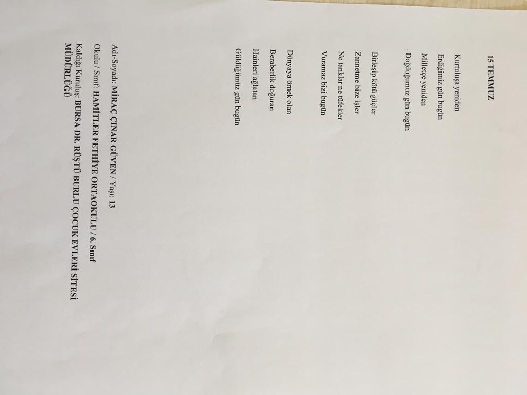 Aile, Çalışma ve Sosyal Hizmetler Bakanlığımızca kuruluşlarımızda bulunan personelimiz, 14 yaş ve üzeri gençlerimiz, huzurevlerinde kalan yaşlılarımız ve kadınlarımız arasında 15 Temmuz temalı resim ve şiir yarışmalarının değerlendirmeleri kurulan komisyon tarafından gerçekleştirildi.