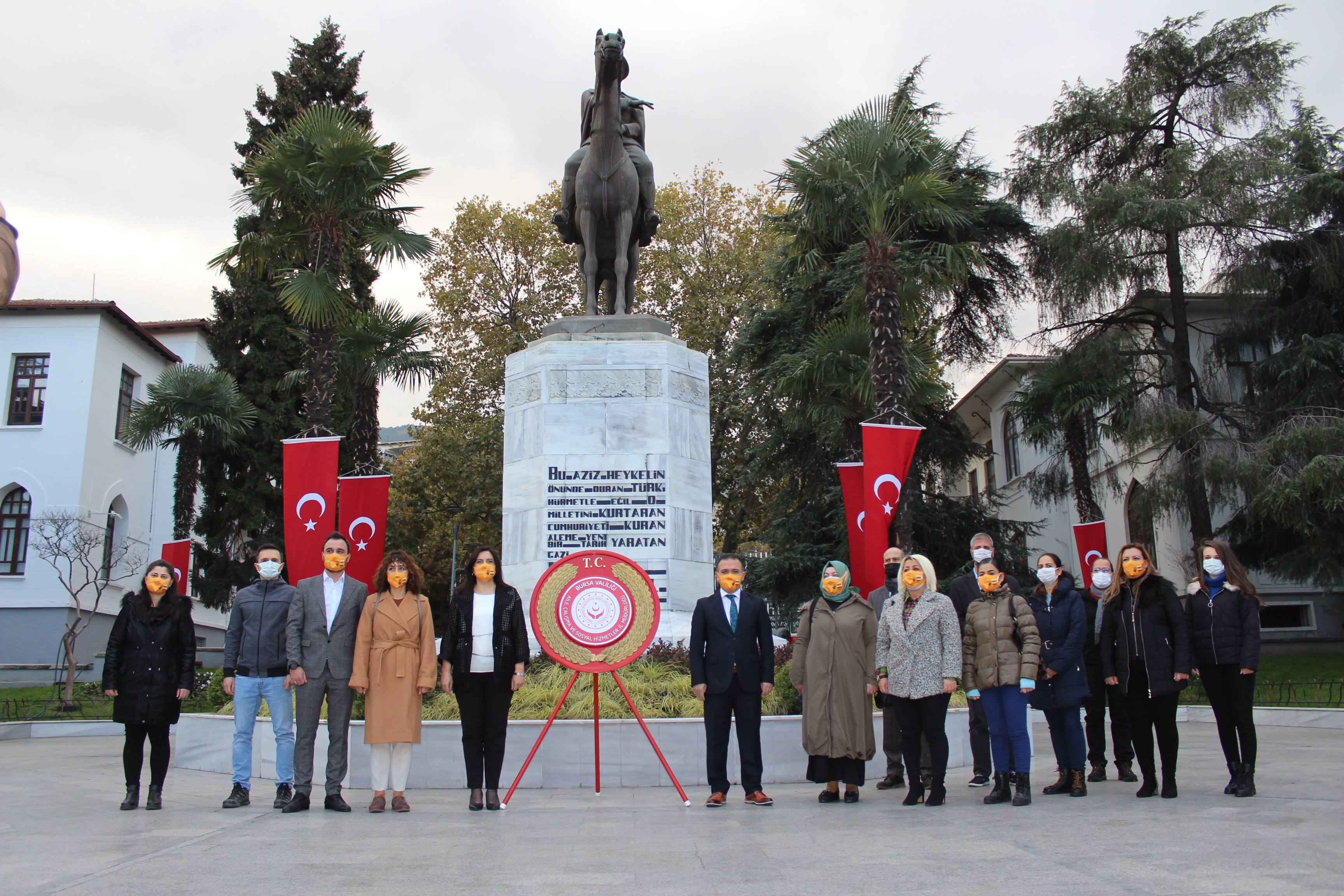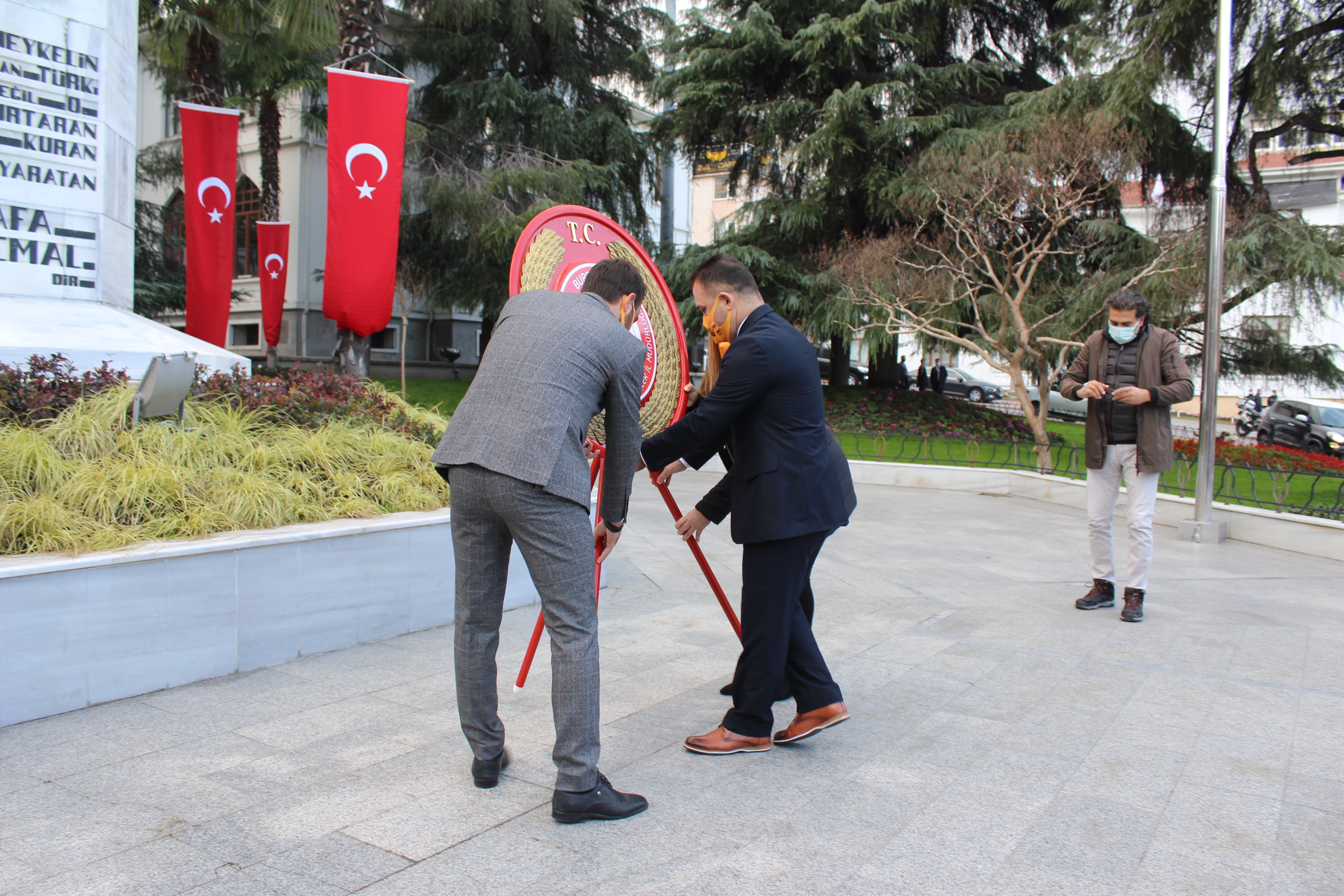 Pandemi tedbirleri kapsamında sosyal mesafe kurallarına uygun olarak gerçekleştirilen törende saygı duruşu ve İstiklal Marşının ardından Atatürk Anıtına çelenkler sunulmuştur.