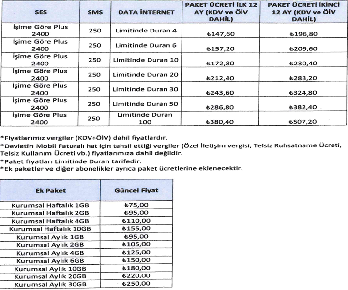 - Halen kurumsal hat kullanan personelimiz 31/12/2027 tarihine kadar mevcut tarifelerini kullanmaya devam edebilecektir. Tarife değişikliği 31/12/2027 tarihinde zorunlu olacaktır.