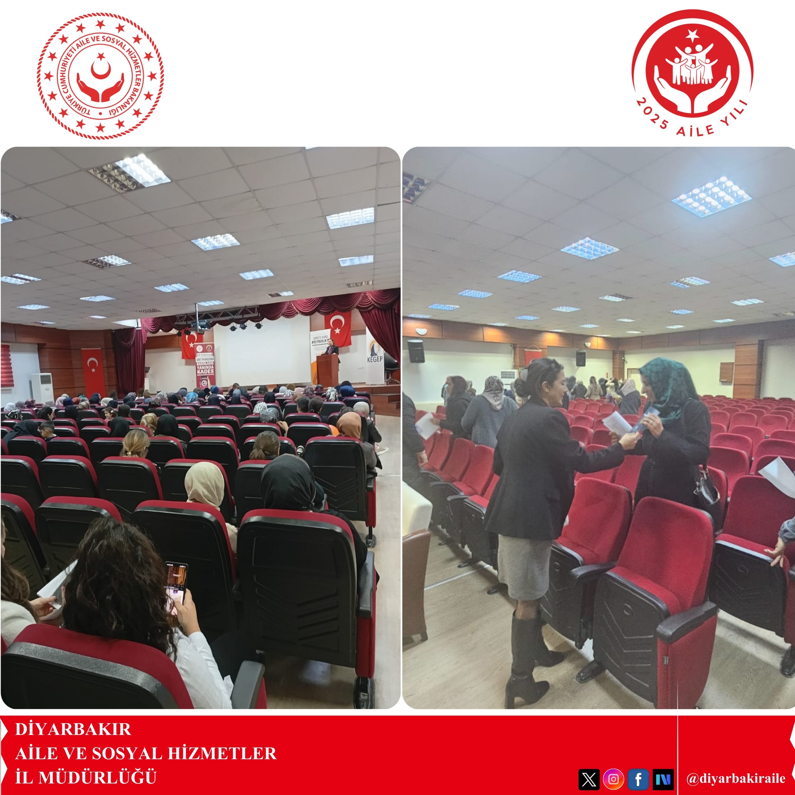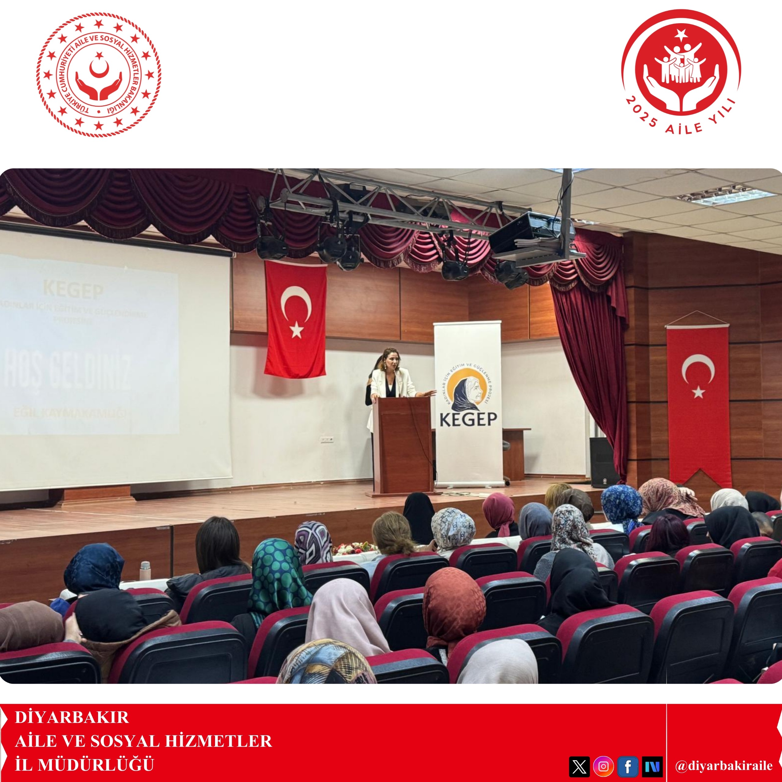 Kayapınar Sosyal Hizmet Merkezi Eğitim Birimi olarak; KEGEP Projesi ve 25 Kasım Kadına Yönelik Şiddete Karşı Uluslararası Mücadele Günü faaliyetleri kapsamında, Eğil Halk Eğitim Merkezi Konferans Salonu’nda kadın vatandaşlara yönelik “Okullaşma ve İletişim” ile “Kadına Yönelik Şiddetle Mücadelede Farkındalık” konularında eğitim verilmiştir. Program sonunda katılımcılara bilgilendirici broşürler dağıtılmıştır.