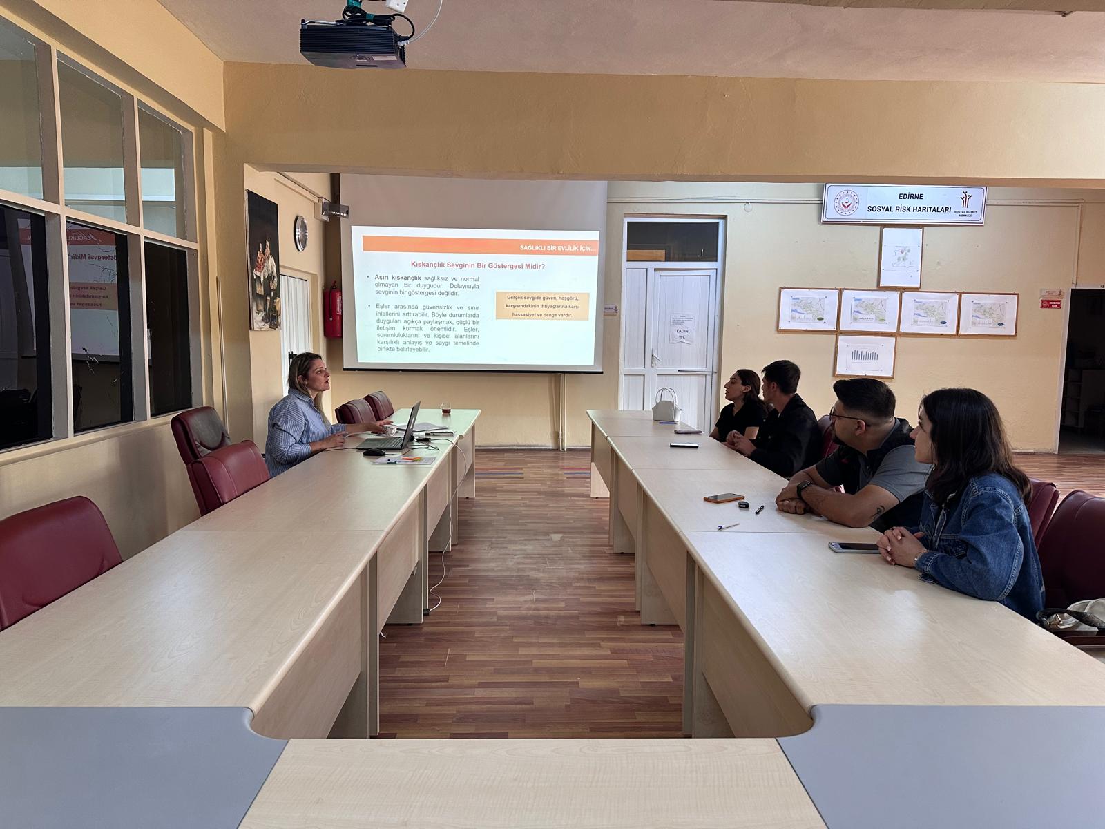 “2025 Aile Yılında Ailenin Korunması ve Güçlendirilmesi” kapsamında Edirne Aile ve Sosyal Hizmetler İl Müdürlüğüne bağlı Sosyal Hizmet Merkezi Müdürlüğünde görevli personeller tarafından Evlenecek Gençlerin Desteklenmesi Projesi kapsamındaki çiftlere Sosyal Hizmet Merkezi Toplantı Salonunda “Evlilik Öncesi Eğitim” düzenlendi. Eğitim soru-cevap ve genel değerlendirmenin ardından sona erdi.