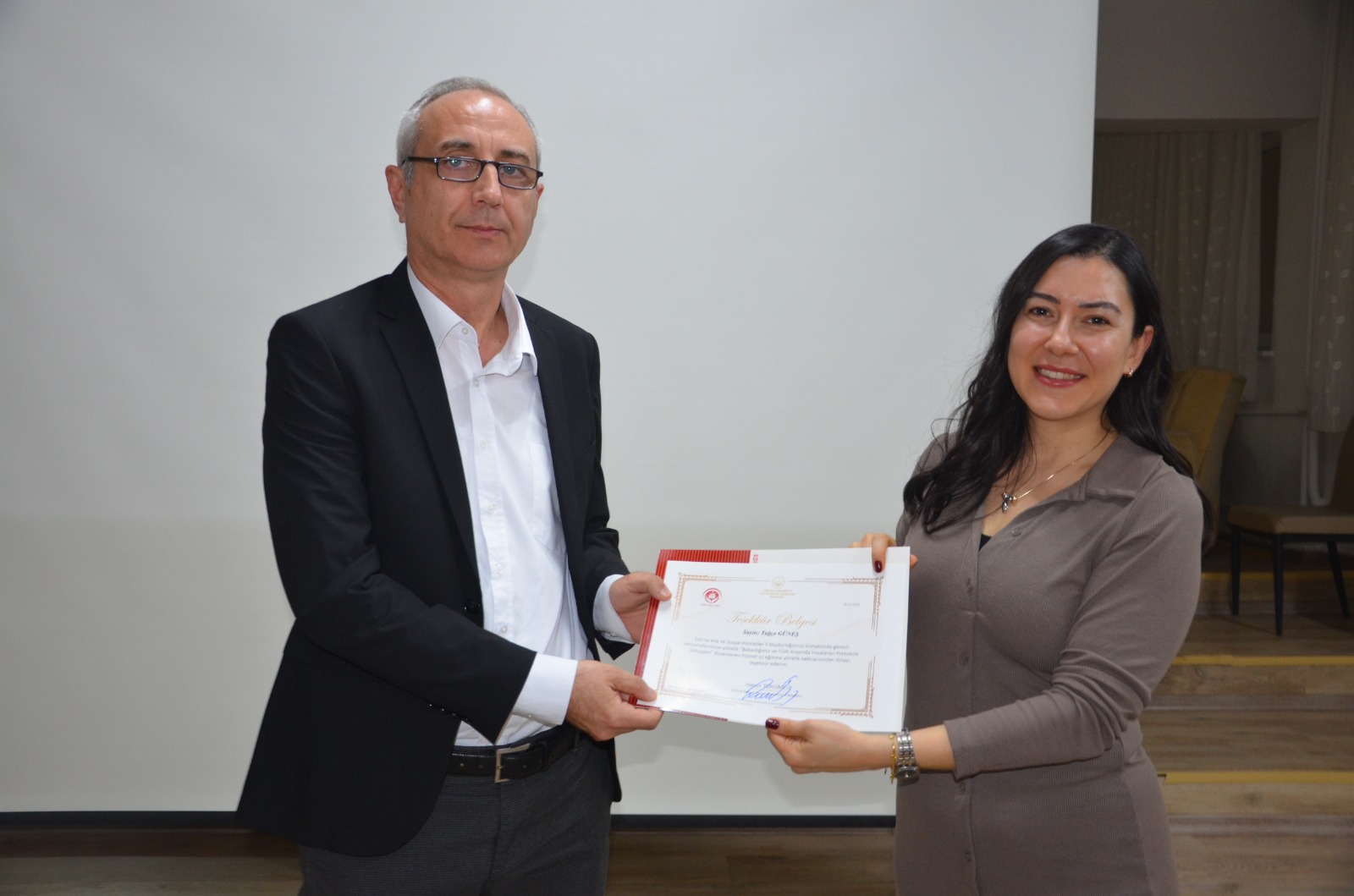 Eğitim sonunda Şiddet Önleme ve İzleme Merkezi Müdür Yrd. Sedat BAŞHUYÜK tarafından eğitim sunumlarını gerçekleştiren TÜİK Edirne Bölge Müdürlüğünde Görevli Sosyolog Tuğçe GÜNEŞ’e teşekkür belgesini takdim etti.