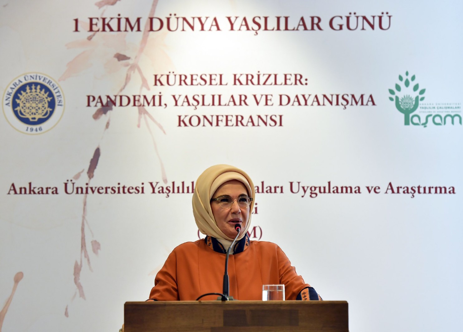 Cumhurbaşkanı Recep Tayyip Erdoğan'ın eşi Emine ERDOĞAN ve Aile ve Sosyal Hizmetler Bakanı Derya YANIK, 1 Ekim Dünya Yaşlılar Günü dolayısıyla Ankara Üniversitesi Yaşlılık Çalışmaları Uygulama ve Araştırma Merkezince (YAŞAM) Rektörlük Senato Salonu'nda gerçekleştirilen, ‘Küresel Krizler: Pandemi, Yaşlılar ve Dayanışma Konferansı'nda yaşlılarla bir araya geldi.
