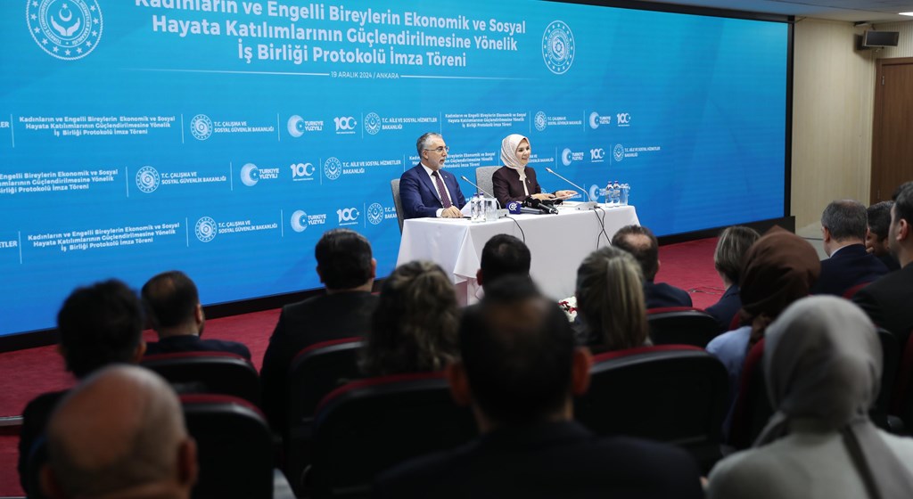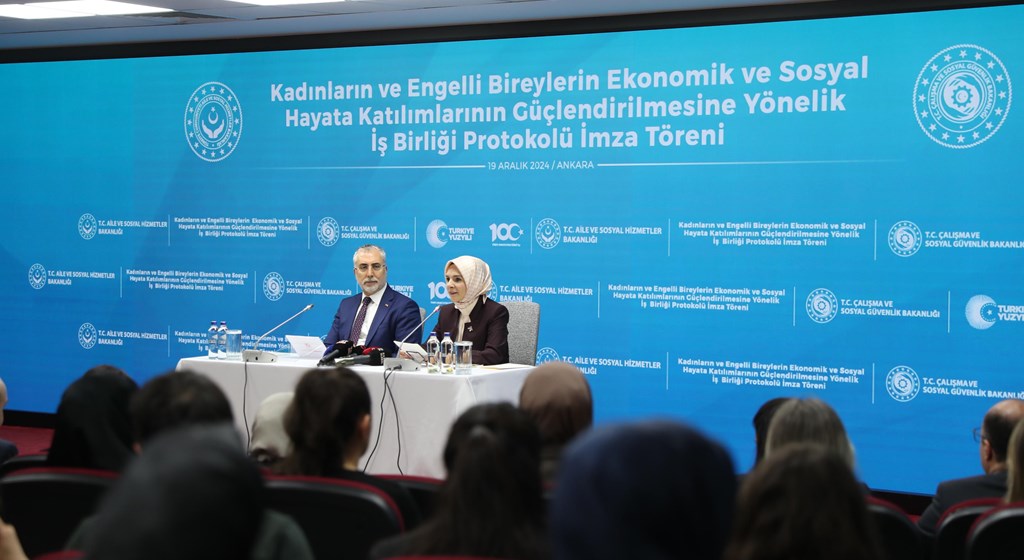 Bakan Göktaş ile Çalışma ve Sosyal Güvenlik Bakanı Vedat Işıkhan'ın katılımıyla Aile ve Sosyal Hizmetler Bakanlığında, Kadınların ve Engelli Bireylerin Ekonomik ve Sosyal Hayata Katılımlarının Güçlendirilmesine Yönelik İş Birliği Protokolü İmza Töreni düzenlendi.
