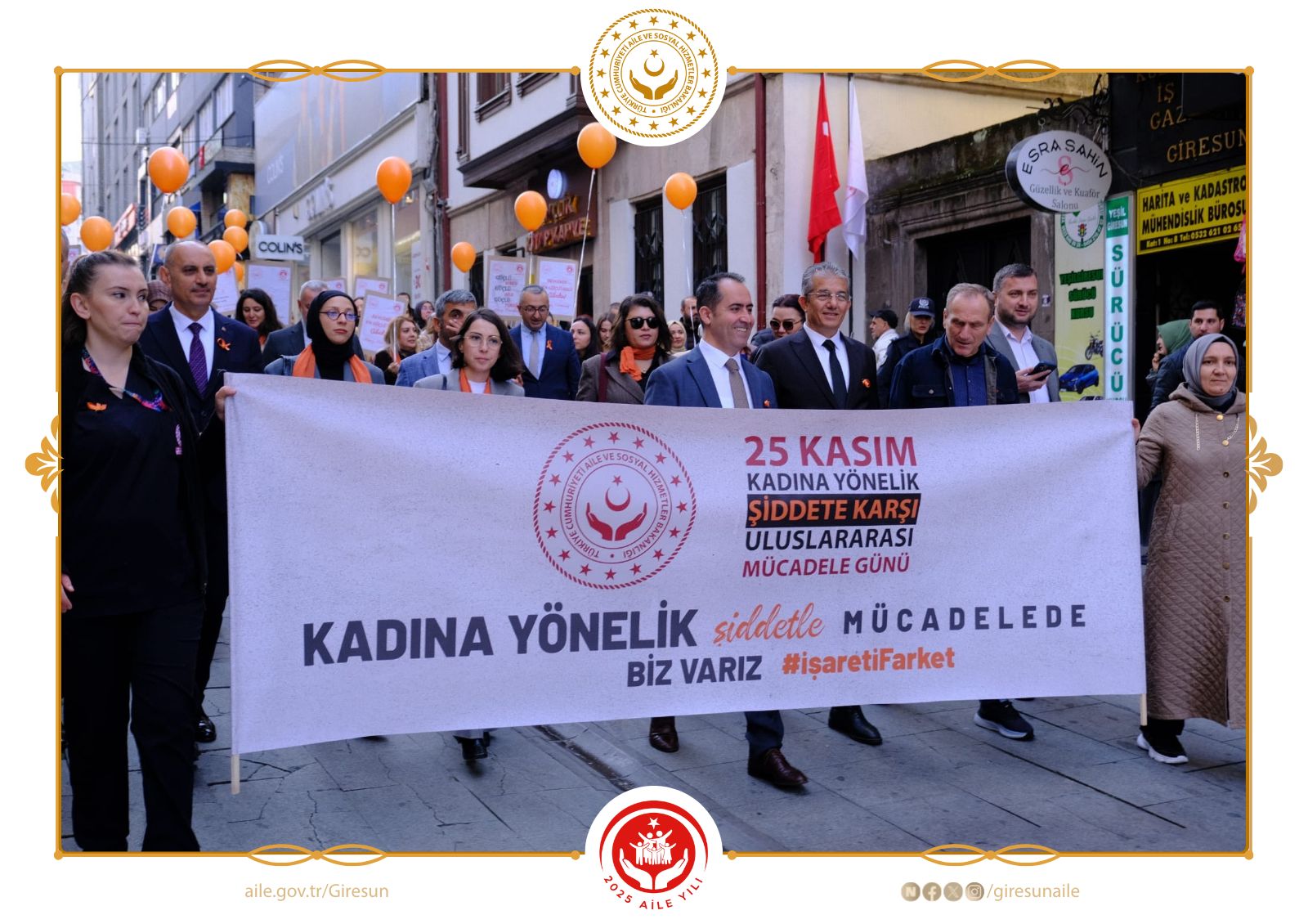25 Kasım Kadına Yönelik Şiddete Karşı Uluslararası Mücadele Günü kapsamında, Giresun Aile ve Sosyal Hizmetler İl Müdürlüğü olarak toplumda farkındalığı güçlendirmek amacıyla farkındalık yürüyüşü gerçekleştirdik. Vali Yardımcımız Mehmet Fatih YAKINOĞLU’nun teşrifleri ve paydaş kurumlarımızın destekleriyle düzenlenen yürüyüş, şiddetsiz bir yaşam idealine verilen güçlü bir mesaj niteliği taşıdı.