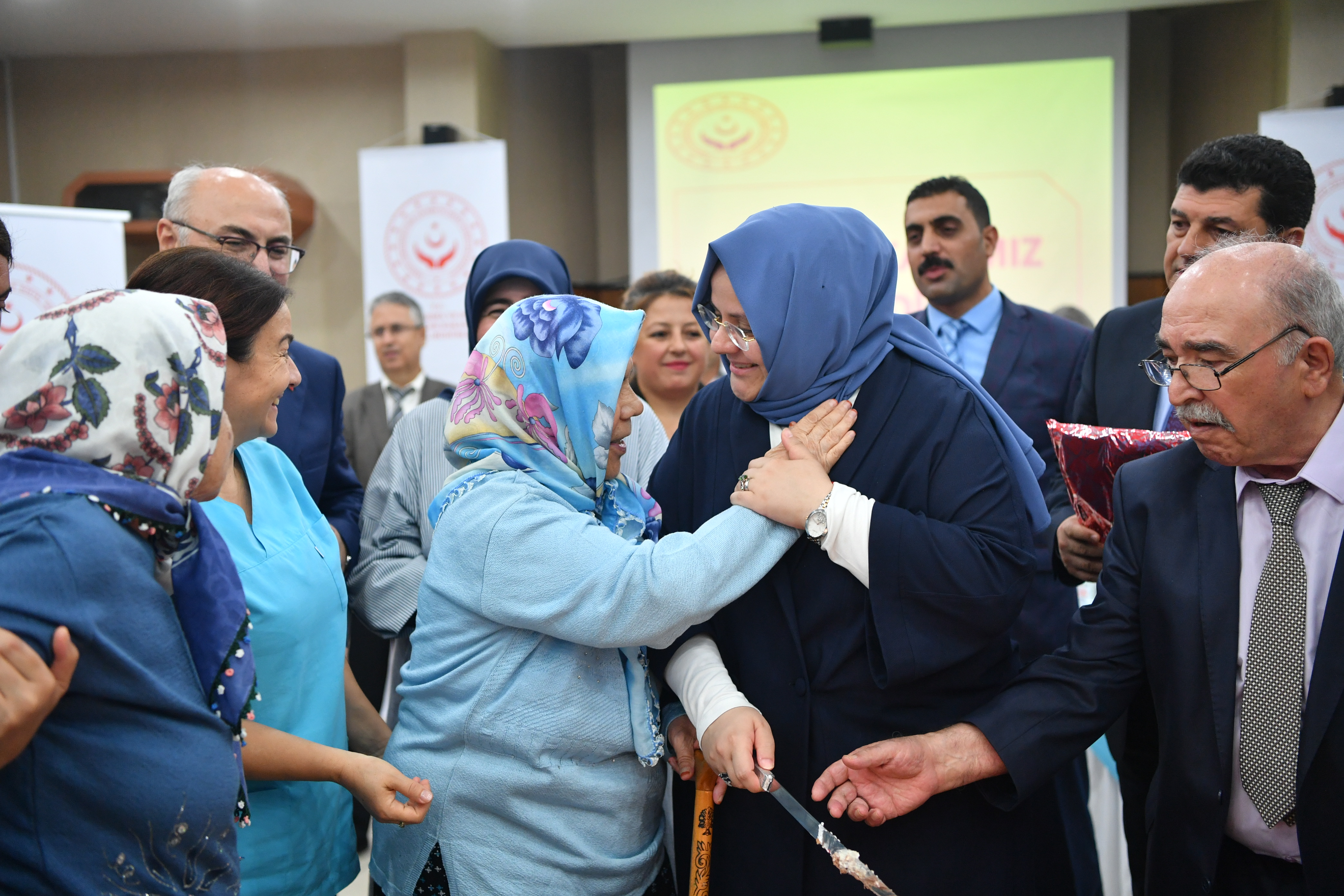 Bakan Selçuk, Aydın Huzurevi’ne gerçekleştirdiği ziyarette de kadın huzurevi sakini tarafından çiçekle karşılandı. Huzurevi sakinlerinin sürpriziyle karşılaşan Bakan Selçuk Bakanlığın logosu ve isminin yazılı olduğu pastayı kesti.