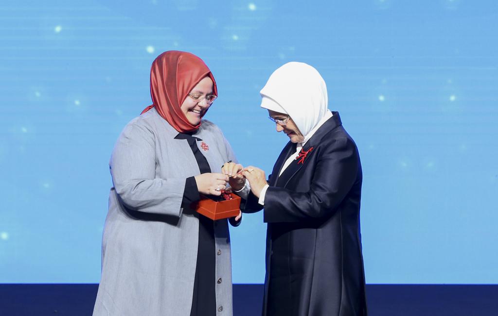 Aile, Çalışma ve Sosyal Hizmetler Bakanı Zehra Zümrüt Selçuk, Cumhurbaşkanı Erdoğan'ın eşi Emine Erdoğan'a "Mercan Seferberliği"nin simgesi olarak mercan rozeti takdim etti.