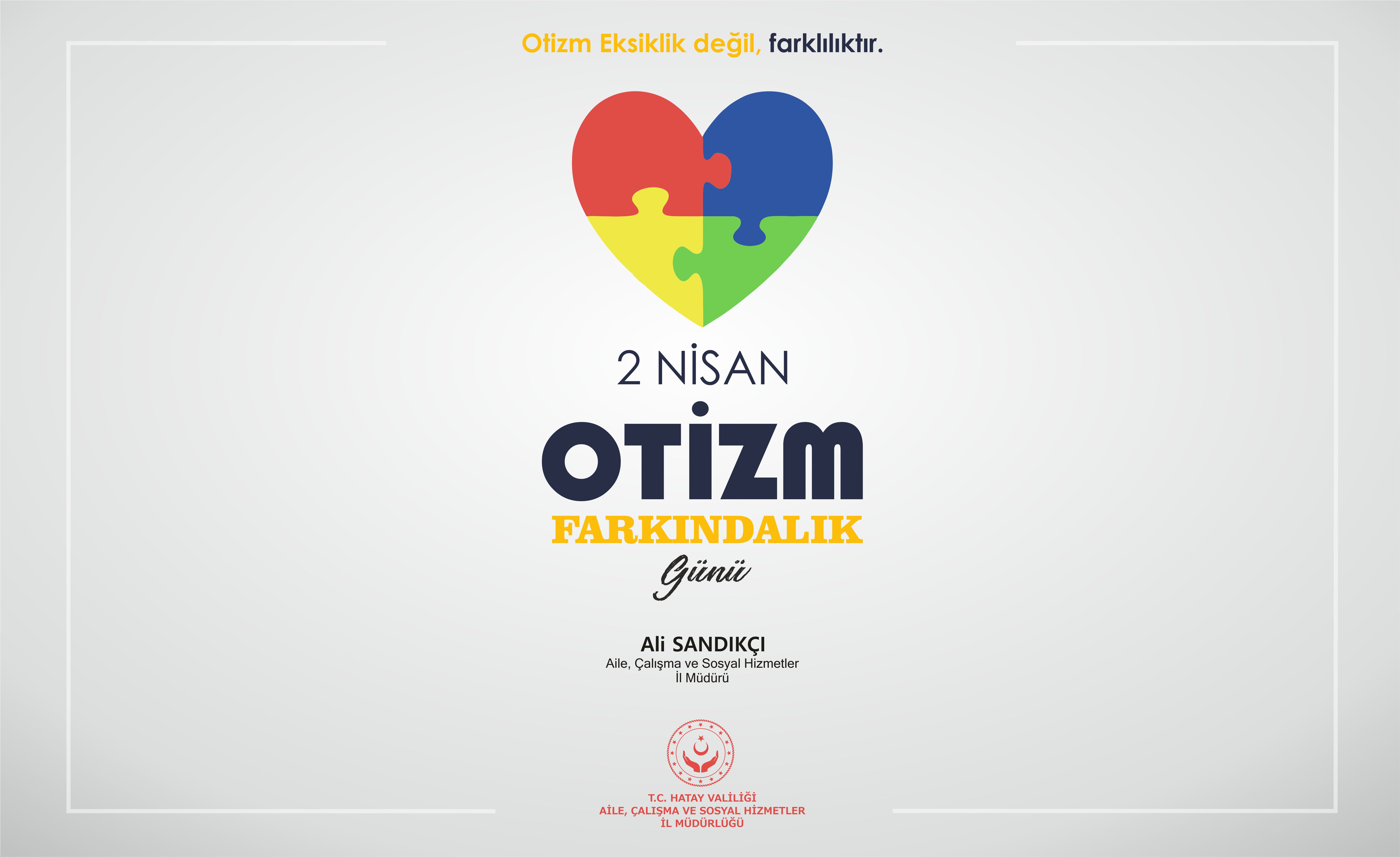 2 Nisan Dünya Otizm Farkındalık Günü vesilesiyle, otistik çocuklarımızın da hayatta mutlu olabilmeleri, sosyalleşmeleri, temel ihtiyaçları olan eğitim ve sağlık hizmetlerinden en iyi ve en uygun şekilde faydalanabilmeleri temennisiyle sevgi ve saygılarımı sunarım.
