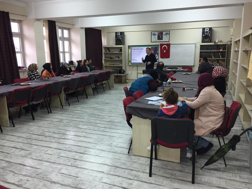 Bakanlığımız ve Türkiye Yeşilay Cemiyeti arasında yapılan işbirliği protokolü çerçevesinde başlatılan ''Türkiye Bağımlılıkla Mücadele Eğitimi'' kapsamında Toki Şehit Ömer Faruk Adaş İlkokulundan 20 veliye ''Teknoloji-Madde Bağımlılığı ve Korunma Yollar'' konusunda eğitim verildi.