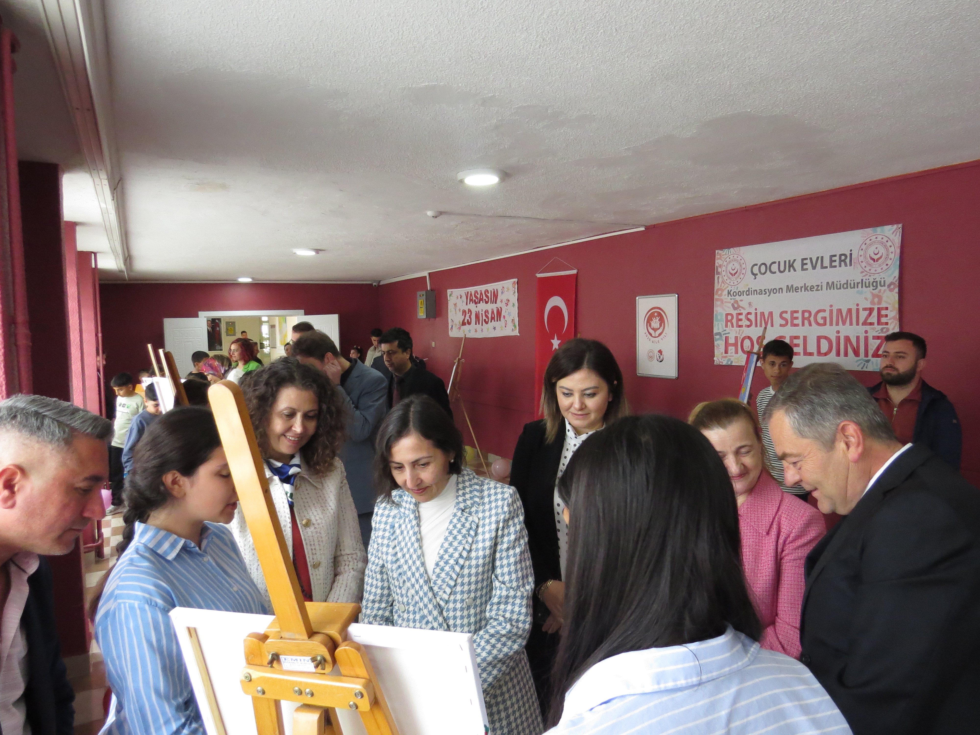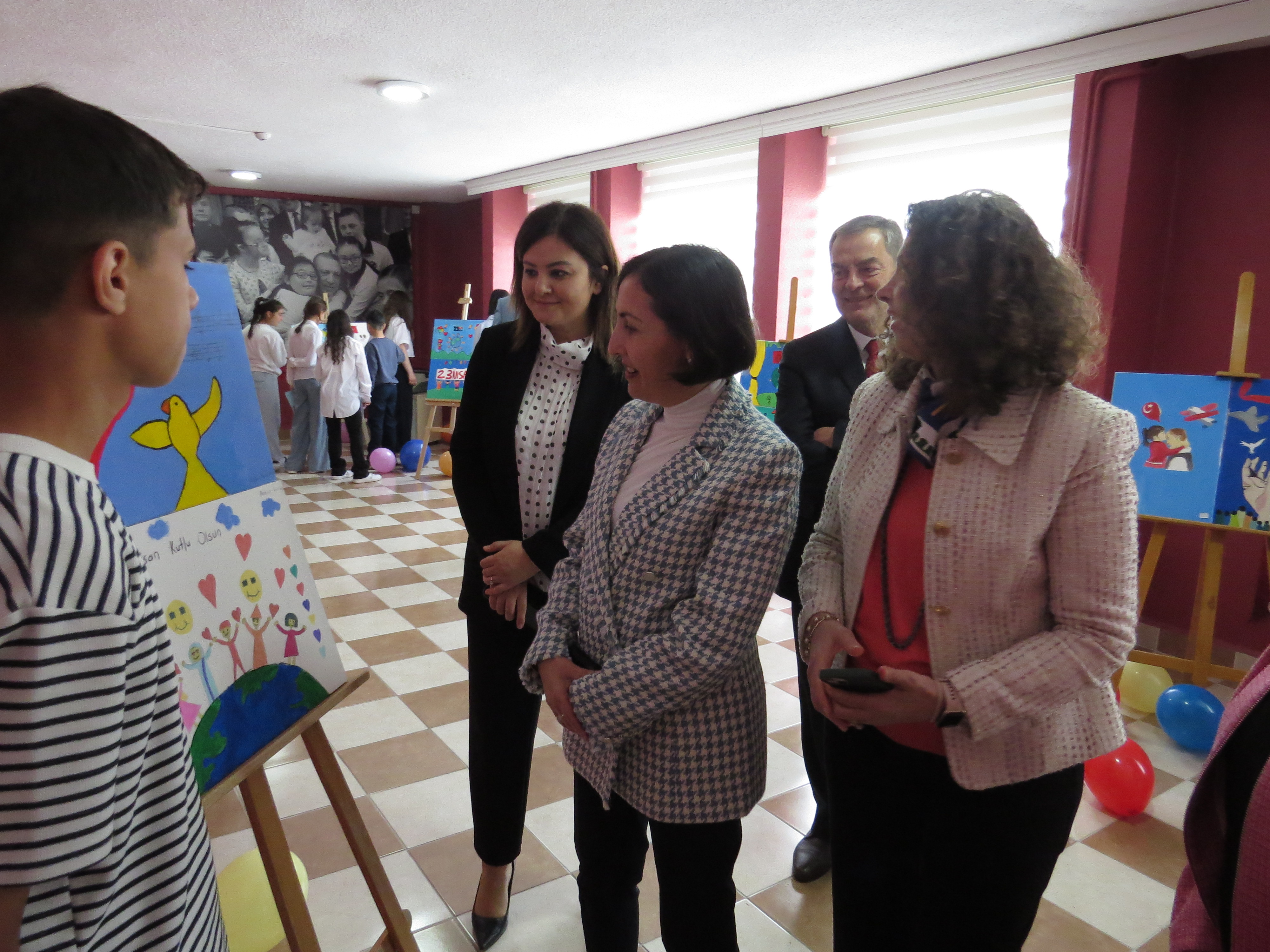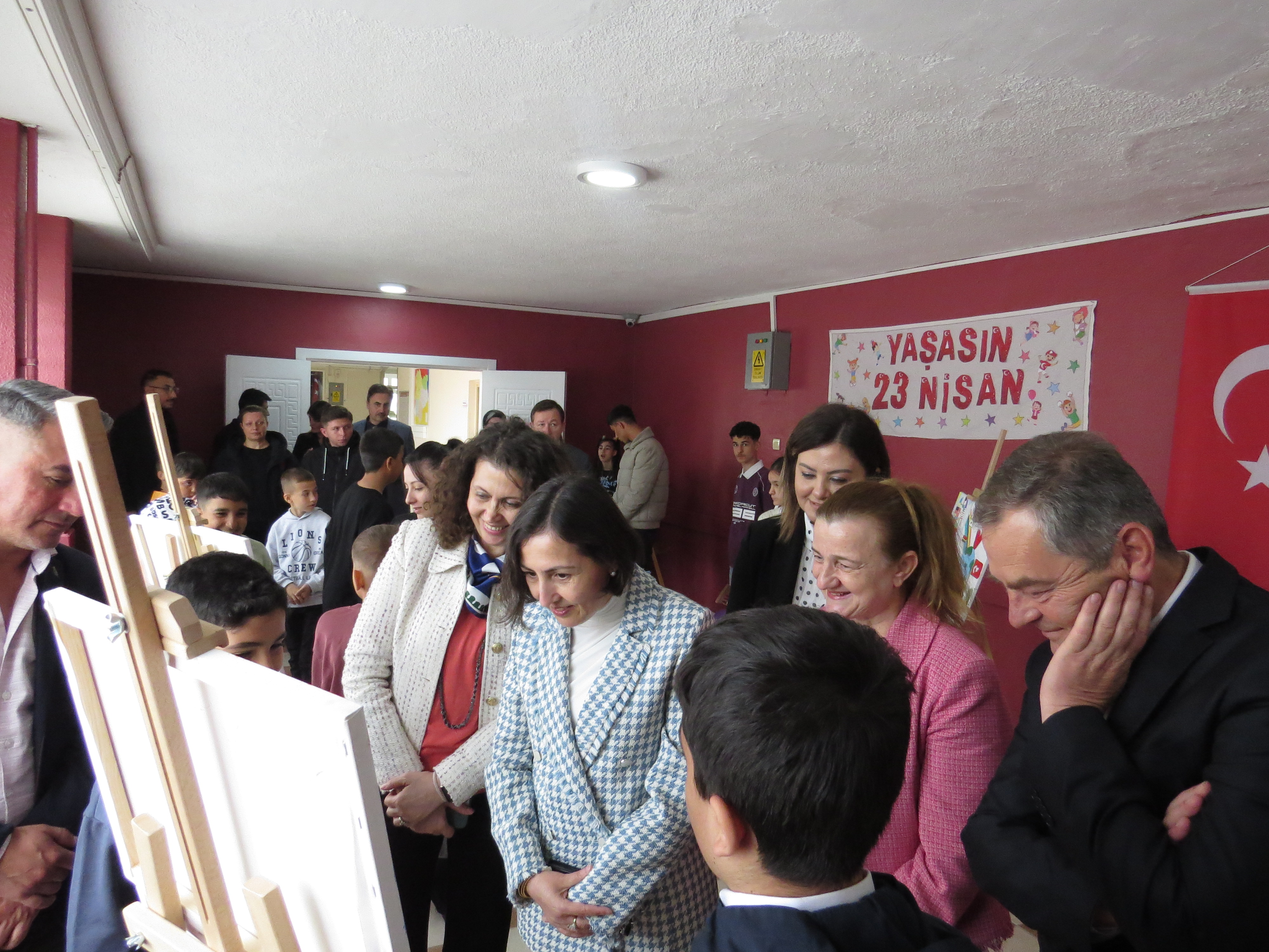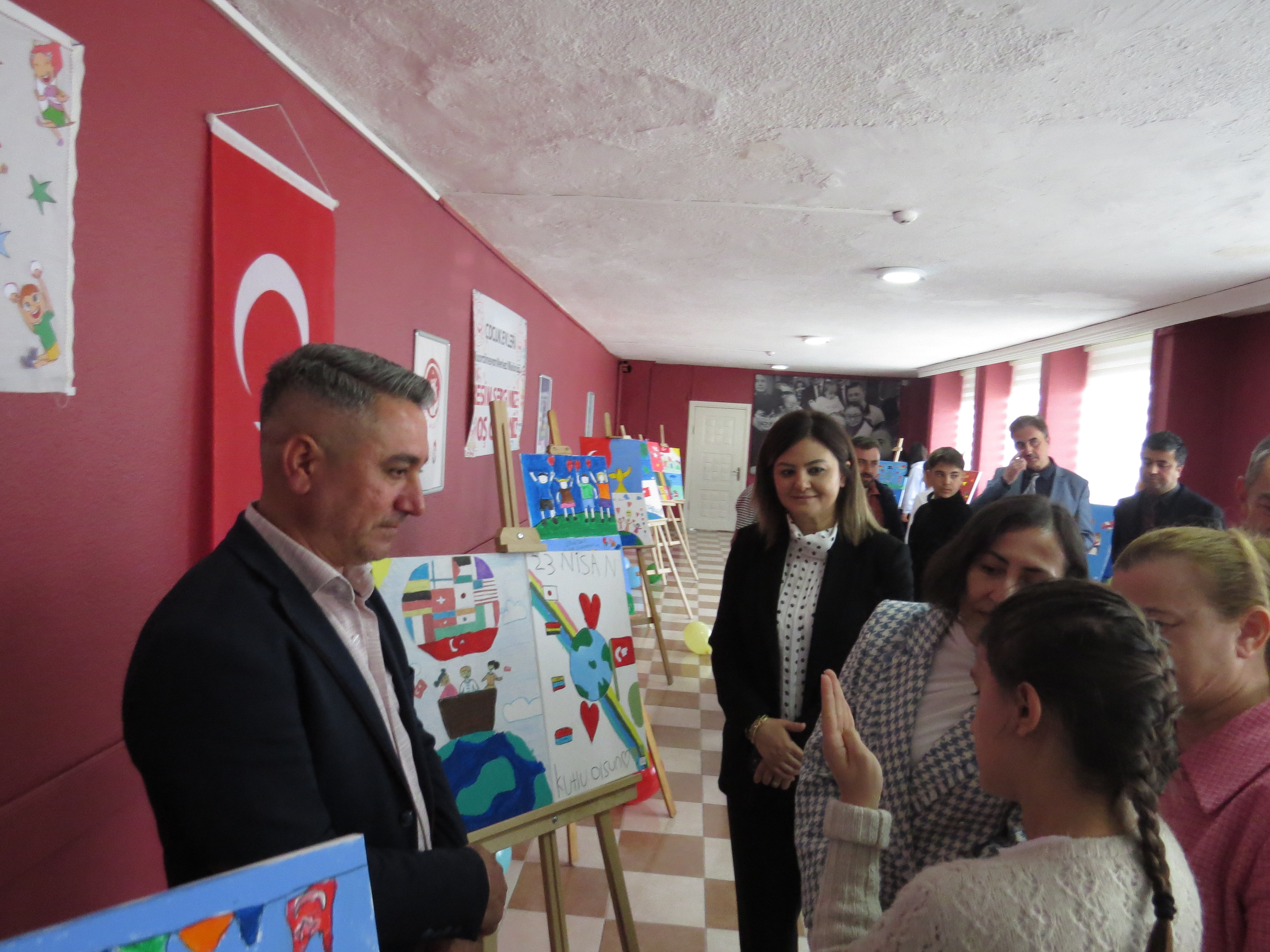 Program, açılış kurdelesinin kesilmesinin ardından serginin gezilmesi ve çocuklarımızın hazırladığı resimlerin tek tek incelenmesiyle devam etmiş; çocuklarımızın 23 Nisan Ulusal Egemenlik ve Çocuk Bayramı coşkusu hep birlikte paylaşılmıştır.