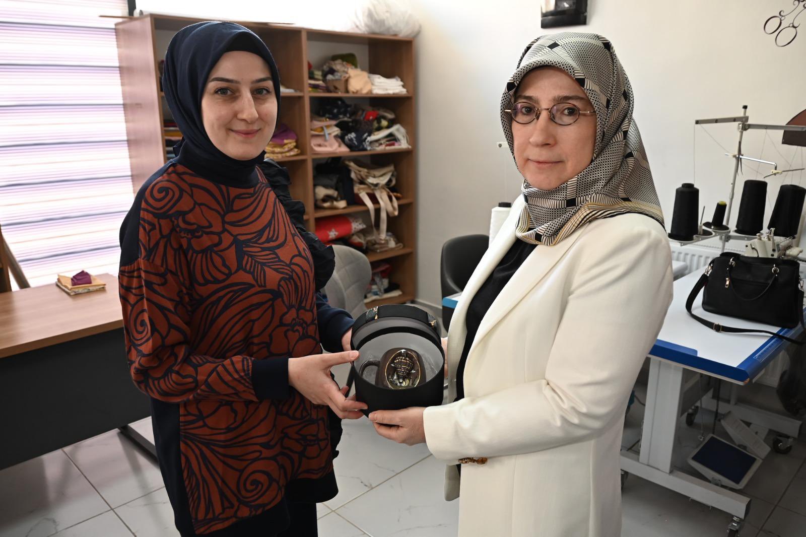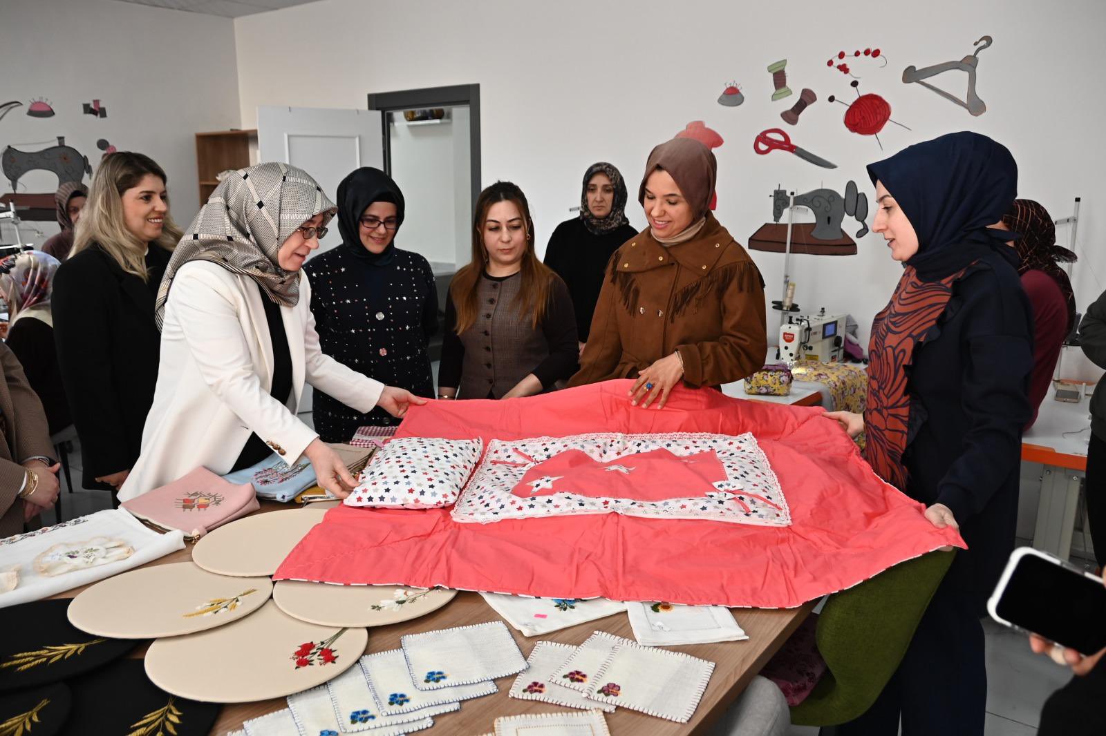 ADEM’de yürütülen el sanatları, seramik ile dikiş-nakış kurslarına katılan kursiyerler ve eğiticilerle sohbet eden Hanımefendi Fidan, gösterilen gayret ve özveriden dolayı tüm katılımcıları tebrik ederek başarılarının devamını diledi.