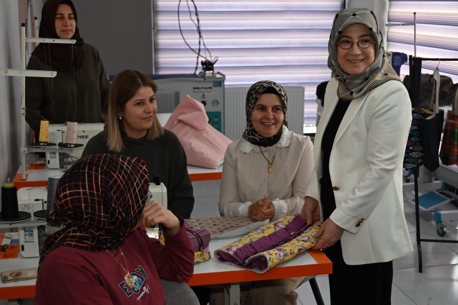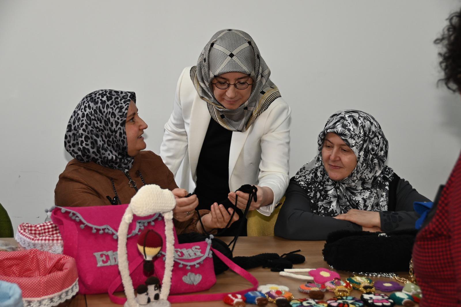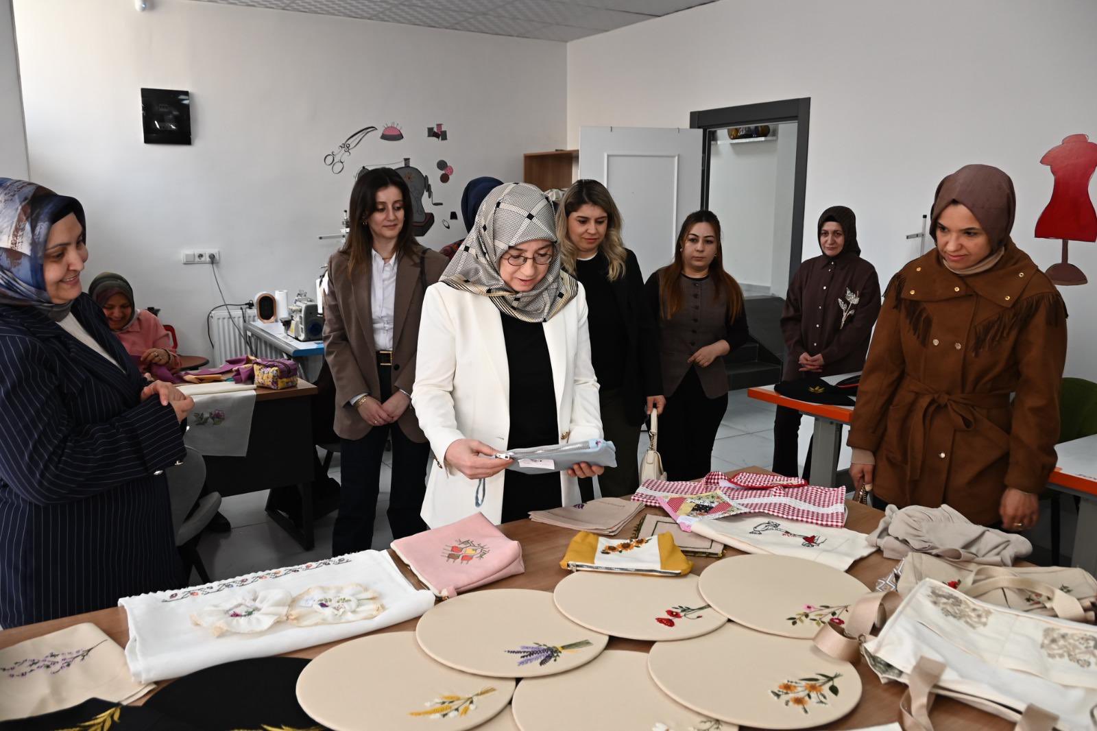 Ziyaret kapsamında kursiyerlerle yakından ilgilenen Prof. Dr. Fatma Fidan, el emeğiyle hazırlanan ürünleri inceleyerek yürütülen çalışmalar hakkında yetkililerden bilgi aldı.
