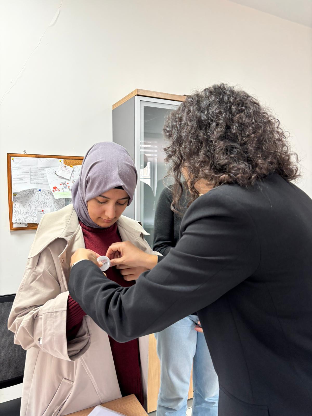 25 Kasım Kadına Karşı Şiddetle Mücadele Günü kapsamında çalışma arkadaşlarımıza "Kadına Yönelik Şiddetle Mücadelede Biz De Varız" rozetleri takıldı.