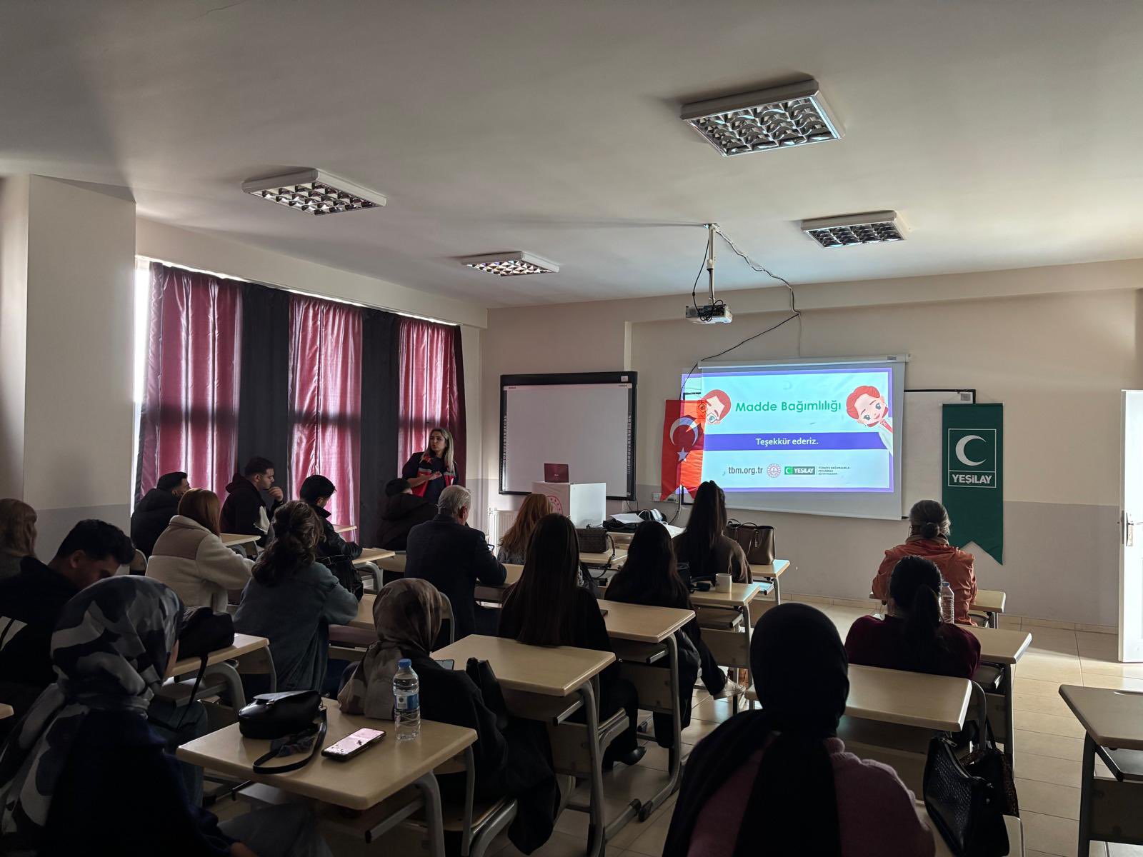 Aile ve Sosyal Hizmetler Bakanlığı ile Yeşilay arasında imzalanan iş birliği protokolü çerçevesinde yürütülen Türkiye Bağımlılıkla Mücadele (TBM) Programı ve Ulusal Uyuşturucu ile Mücadele Eğitim Programı (UMEP) Pertek Sakine Genç Meslek Yüksekokulu öğrencilerine yönelik olarak “Madde Bağımlılığı” konulu eğitim gerçekleştirildi. Eğitimde, Madde bağımlılığının birey ve toplum üzerindeki olumsuz etkileri ile mücadele yöntemleri hakkında bilgiler aktarıldı.